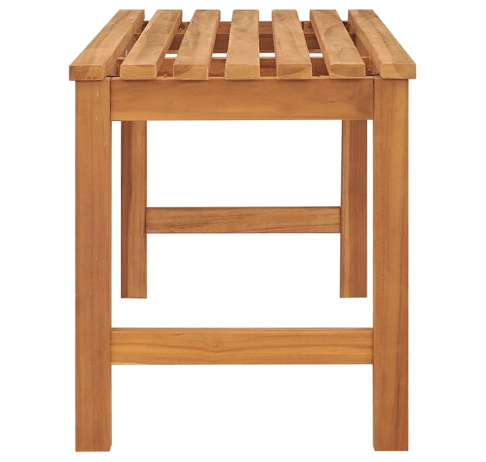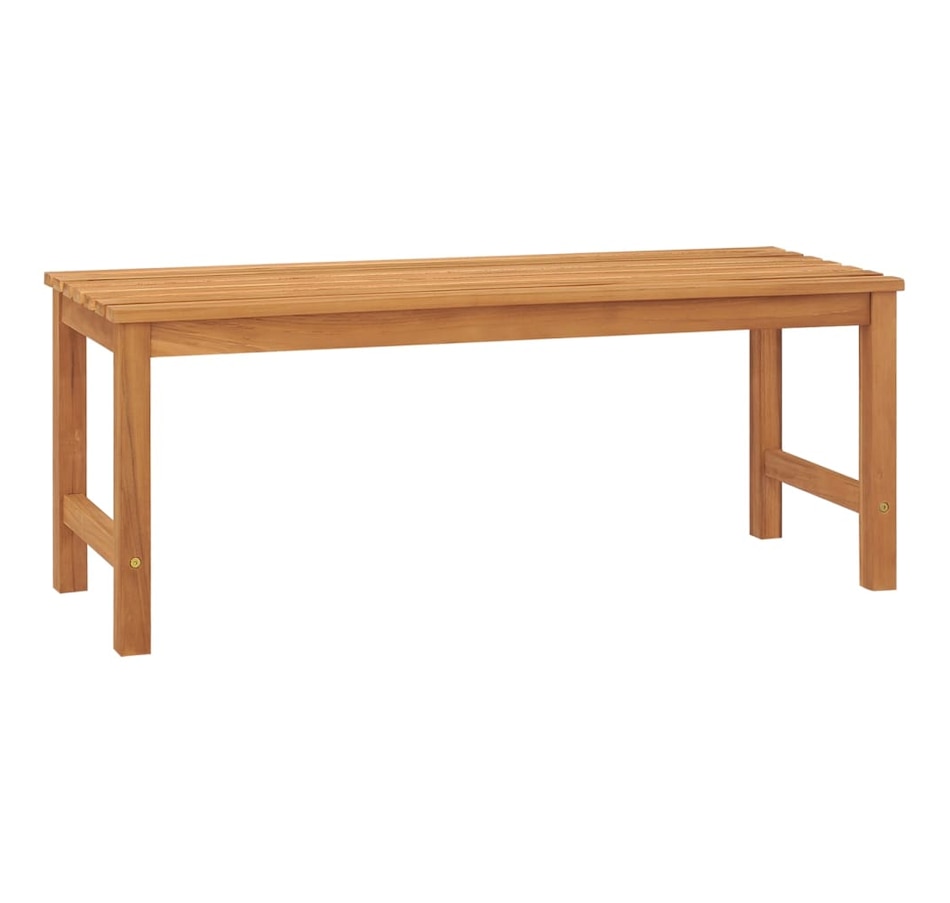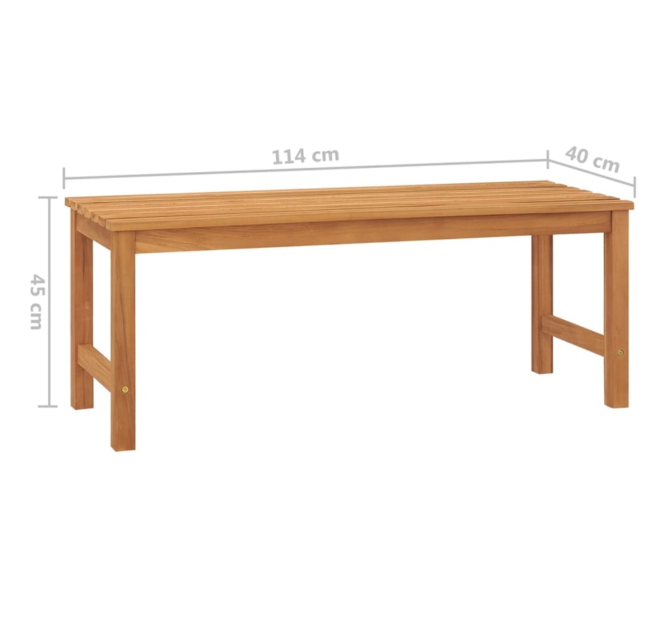 This wooden outdoor bench, with a neat but practical design, takes your living space to the next level! It's also perfect for indoor use. Made from extremely durable teak hardwood, this piece of teak furniture has been seasoned, kiln dried and then finely sanded to give it a very smooth appearance. Teak wood is known for its exceptional weather resistance, making it far more suitable for garden furniture than any other type of wood. Teak wood is the ideal choice if you want to buy durable garden furniture.Thanks to its total length of 114 cm, our garden bench can accommodate up to 3 people.Note: in order to extend the life life of your outdoor furniture, we recommend that you clean it regularly and not leave it outside unprotected unnecessarily.Cleaning: Use a mild soapy solution.Storage: if possible, store in a cool, dry place inside. If the product is stored outdoors, protect it with a waterproof cover. Wipe and dry excess water or snow from flat surfaces after rain or snowfall. Allow sufficient air circulation to avoid moisture damage.