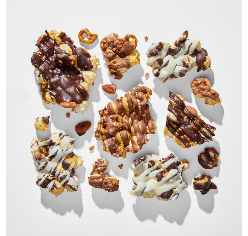 • Pecan Pie Popcorn (caramel popcorn with nuts, mini pretzels, toffee pieces and milk Belgian chocolate)