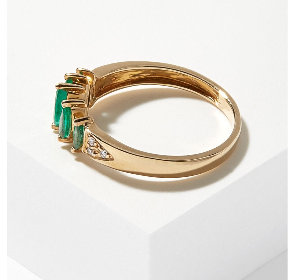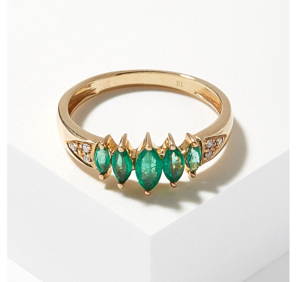 • (2) 2 x 4mm (0.16 ctw), (2) 2.5 x 5mm (0.24 ctw), (1) 3 x 6mm (0.21 ctw) marquise shape, prong set & faceted Emerald (0.61 av. ctw)