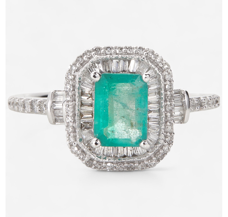 Make a statement with this stunning ring from Gem Creations. This beautiful diamond ring features a striking emerald surrounded by round and baguette diamonds, creating a dazzling display of sparkle. This piece offers a perfect balance of bold elegance and refined luxury. Whether for a special occasion or everyday wear, this ring will surely captivate attention. Grab yours today right here at TSC!