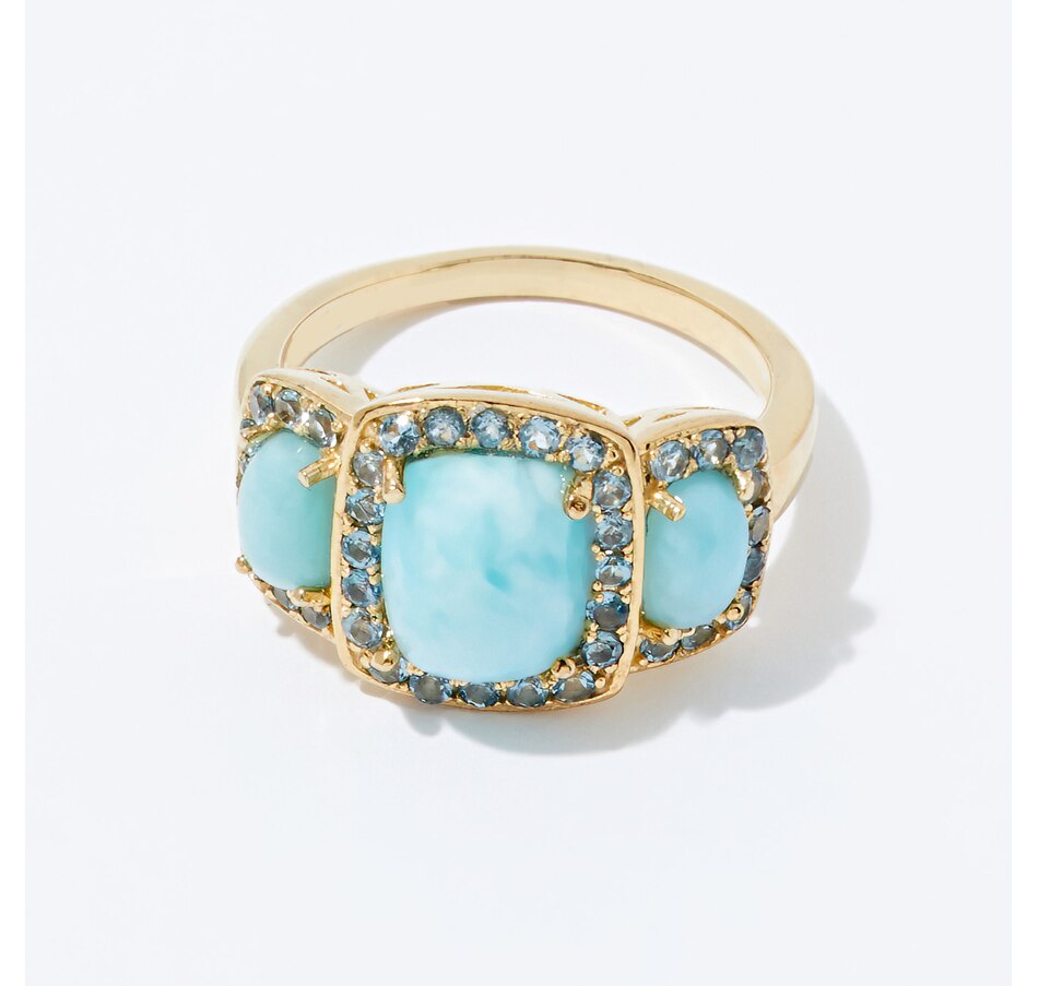 • (1) 9x7mm cushion cabachon, prong set larimar