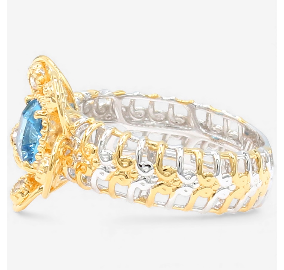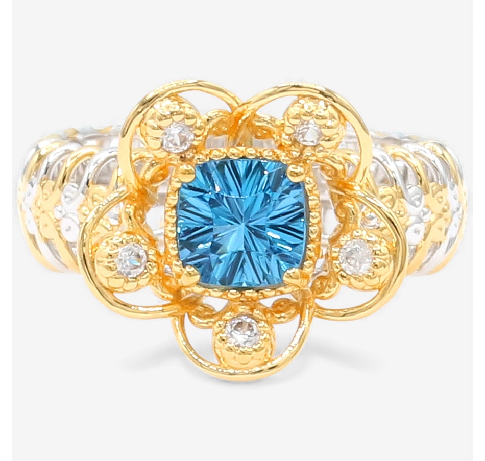 Add a pop of colour with this palladium silver ring from Gems En Vogue, featuring a dazzling Swiss blue topaz in a striking millennial cut. Sparkling white zircon accents enhance the design's brilliance, creating a look that’s both elegant and eye-catching. Finished with luxurious gold and rhodium plating, this ring adds sophistication to any ensemble. Made in Canada and nickel-free, it’s a timeless addition to your collection.