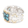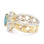 • Bowtie Ring: (7) 5x3mm oval prong set & faceted teal kyanite (2.31 av. ctw), (2) 4x3mm pear shape, prong set & faceted teal kyanite (0.40 av. ctw)