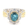 • Halo Ring: (1) 9x7mm oval prong set & faceted teal kyanite (2.25 av. ctw), (10) 2.5mm round shape, prong set & faceted white zircon (1.12 av. ctw)