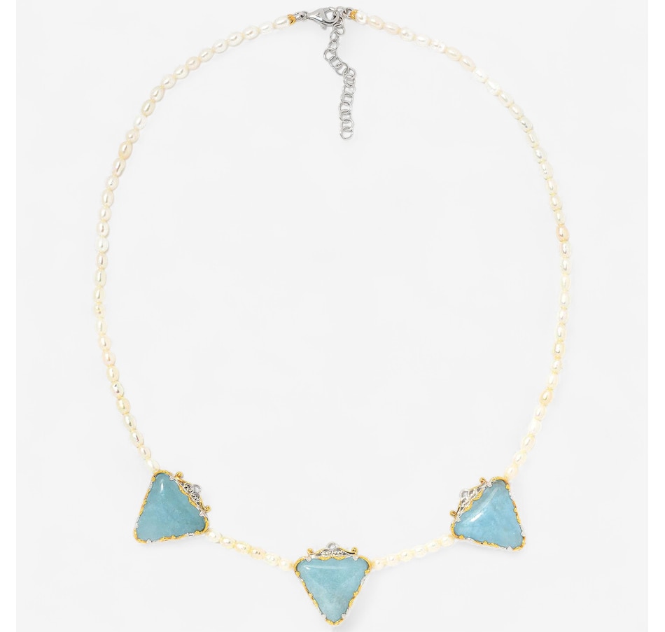 Silver Palladium Aquamarine And Rice Pearl Necklace