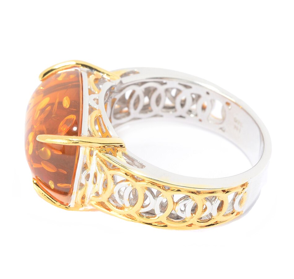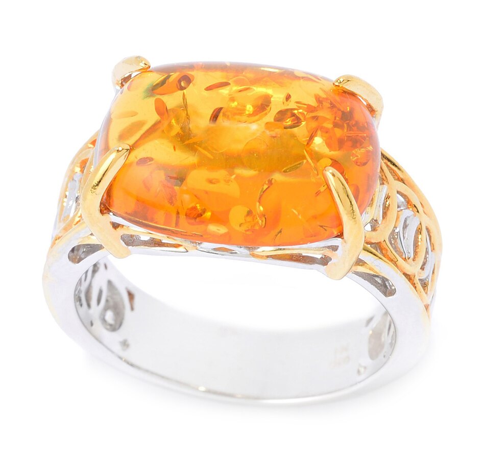 • (1) 18 mm x 13 mm cushion cabochon, prong-set amber (13.39 av. ctw)
