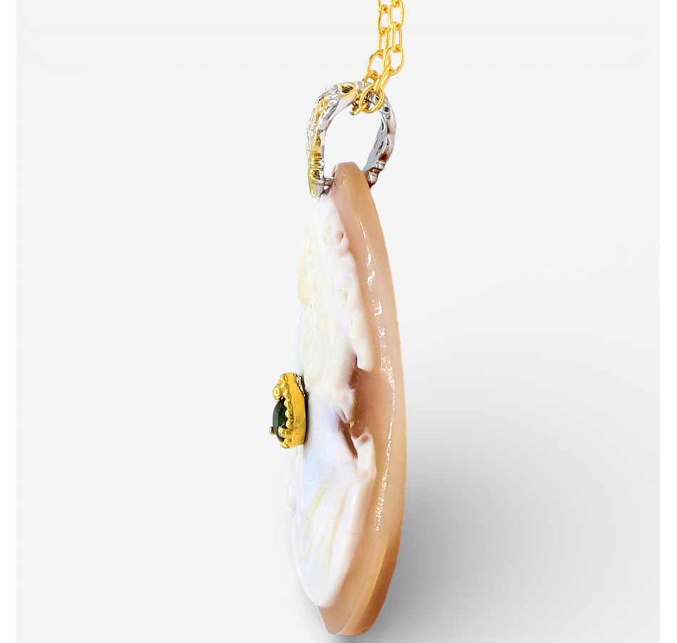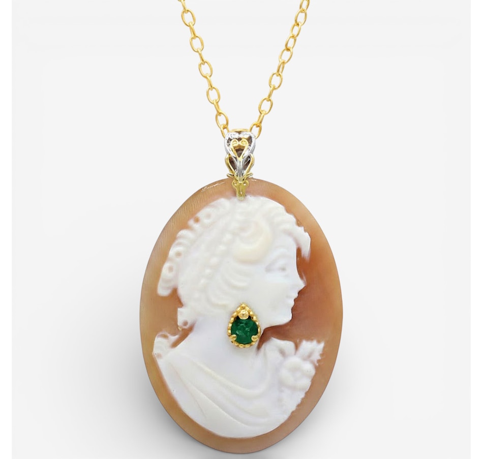 Celebrate old-world artistry with this exquisitely detailed Gems en Vogue cameo pendant. The cameo is the star of the show, framed by palladium silver with rich 24K yellow gold and white rhodium accents. A subtle grizzly emerald adds a whisper of colour, while the adjustable chain offers versatile styling.
