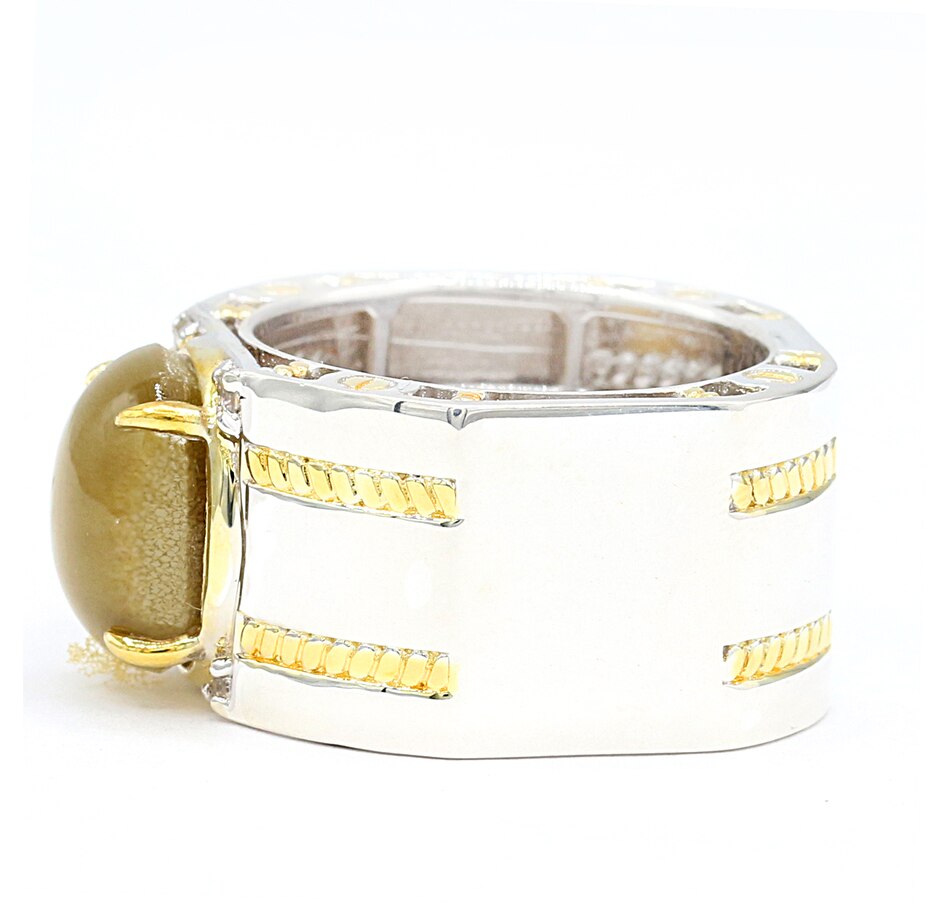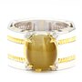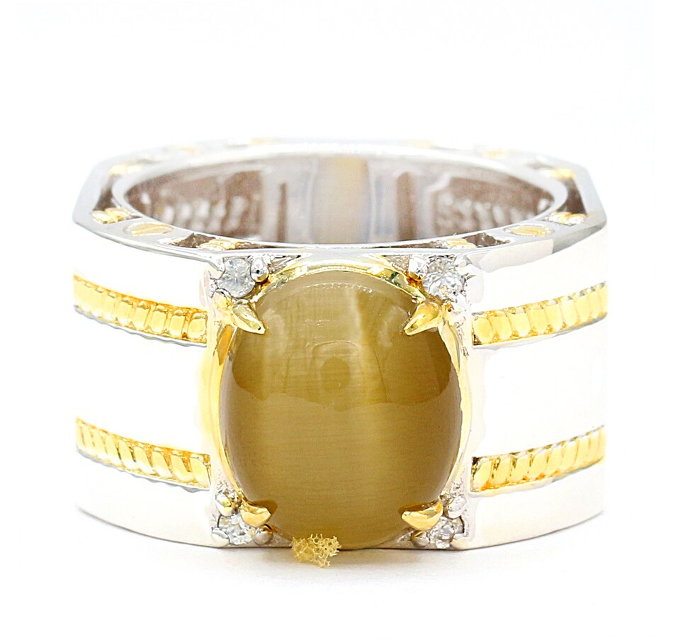 • (1) 10.5 mm x 8.5 mm oval cabochon, prong-set cat's eye apatite (7.16 ctw)