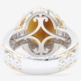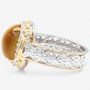 Experience the mystique of elegance with this palladium silver cat’s eye quartz and white zircon ring. The captivating cat’s eye quartz shimmers with a unique, luminous glow, perfectly complemented by the brilliance of white zircon. Designed with a refined side gallery and smooth under gallery for ultimate comfort, this piece is elevated by luxurious 24K yellow gold and white rhodium plate accents. A true fusion of artistry and sophistication, this ring is for those who dare to stand out.