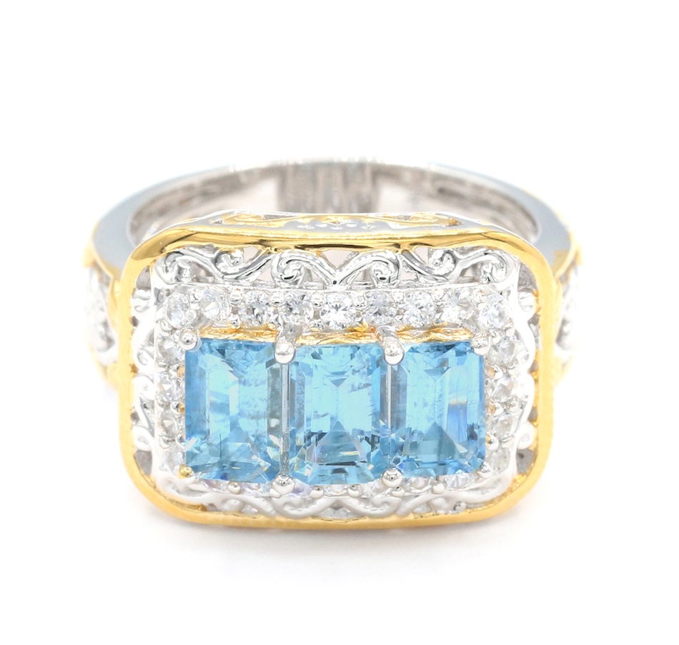 • (3) 6 mm x 4 mm octagonal, prong set and faceted Tanzania aquamarine (1.50 av. ctw)
