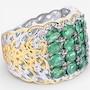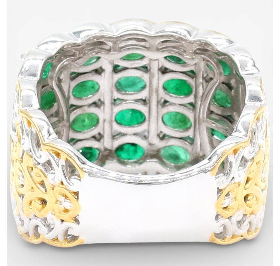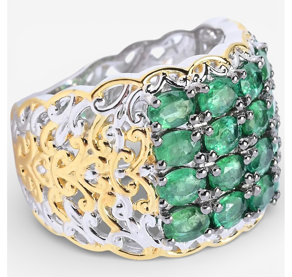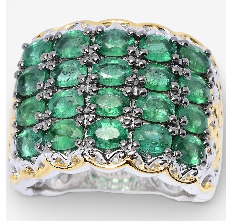 Make a bold statement with the luxurious brilliance of the Gems en Vogue emerald four row ring. Featuring 20 faceted Grizzly emeralds, this stunning design boasts a combined 3.12 carats of vivid green beauty arranged in four elegant rows. Crafted in durable palladium silver with opulent 24K yellow gold plating and accented with white rhodium, this ring offers a rich two-tone finish that enhances its striking colour.Â