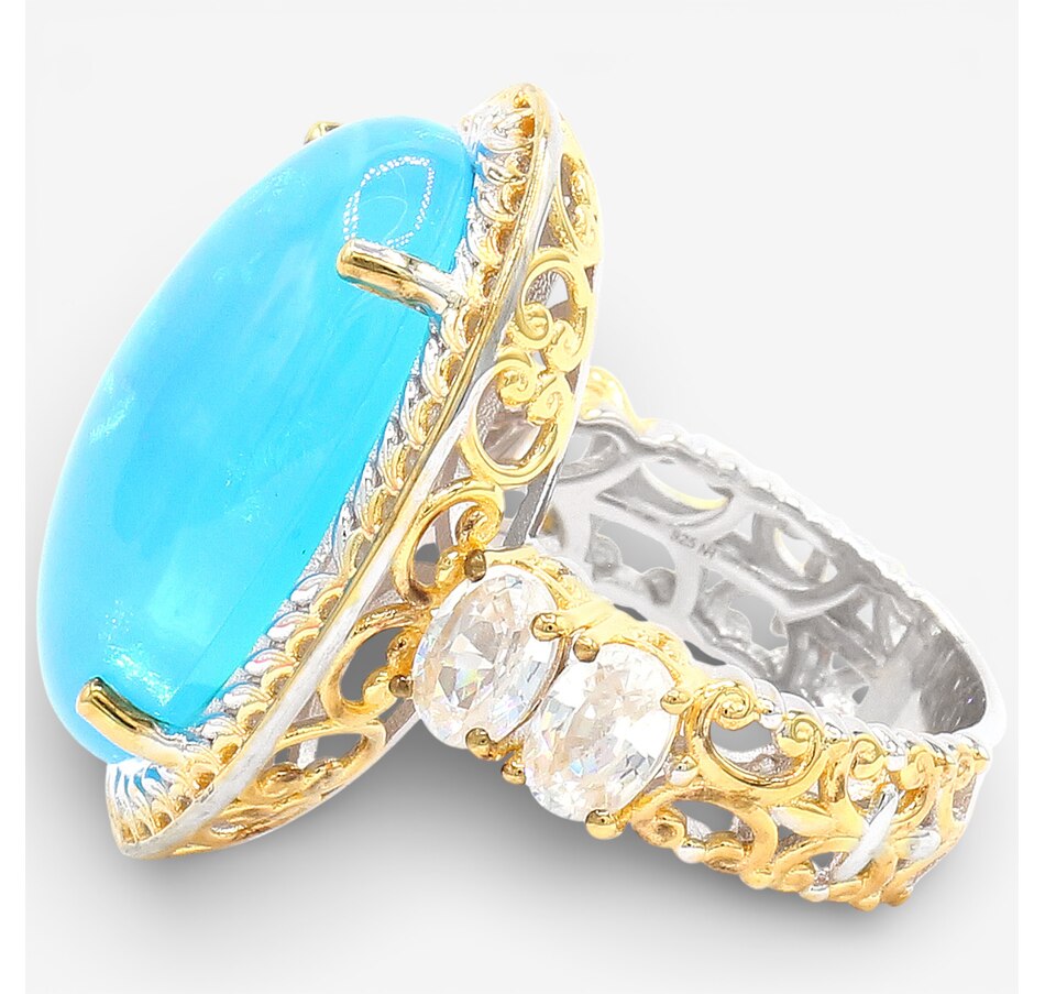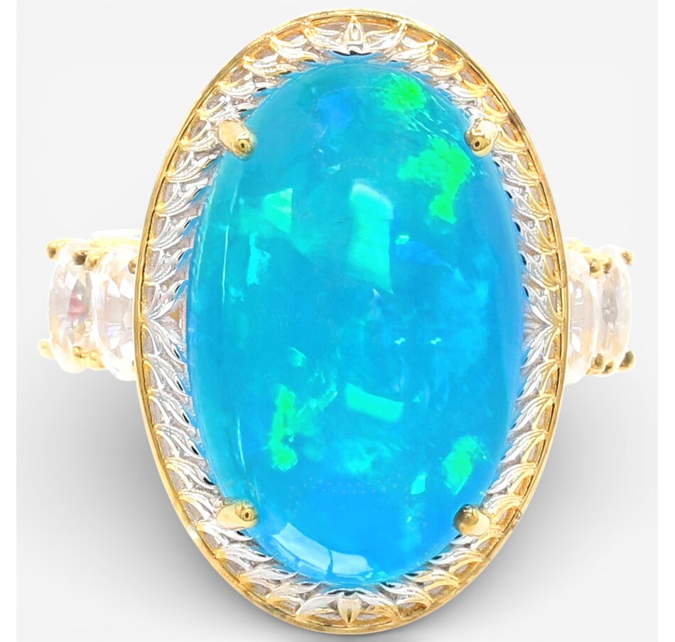 Bold in scale and rich in colour, this one‑of‑a‑kind ring from Gems en Vogue features a striking Paraiba opal cabochon enhanced by four white zircons that add a bright, balanced sparkle. Gold and rhodium accents highlight the vivid centre stone, while the smooth undergallery ensures a comfortable, luxurious fit.