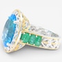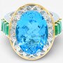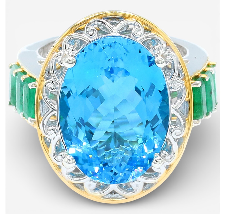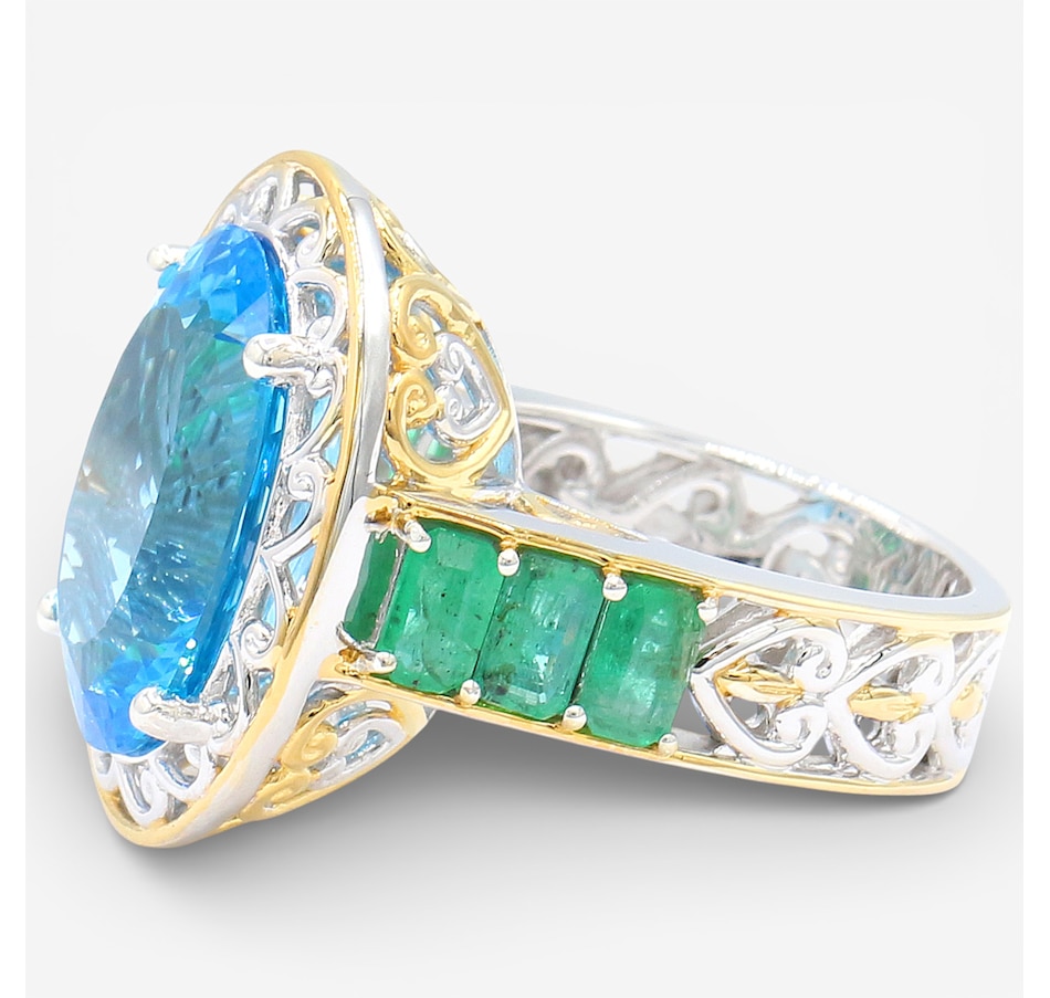 A vivid super Swiss blue topaz takes centre stage in this dynamic one‑of‑a‑kind design from Gems en Vogue, complemented by six rich green grizzly emeralds. Gold and rhodium accents highlight the colour contrast, while the smooth undergallery ensures the ring feels as good as it looks.