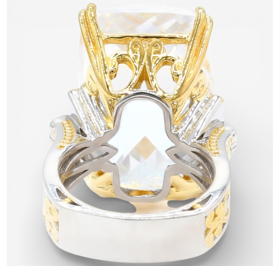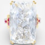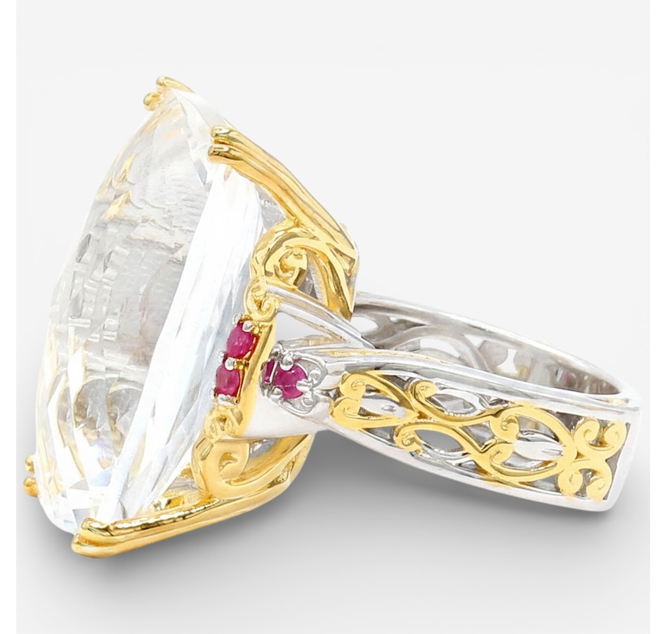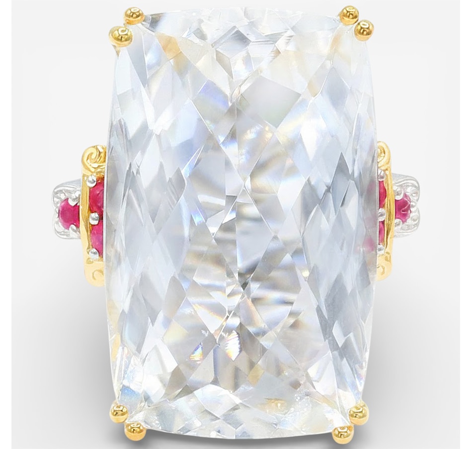 Bold, sculptural and striking, this Gems en Vogue ring centres on a large, faceted rock crystal quartz that sparkles with dramatic brilliance. Ruby accents bring vibrant contrast, while palladium silver with 24K gold and rhodium plating elevates the design. With its impressive presence and Canadian craftsmanship, this statement ring adds instant glamour to any look.