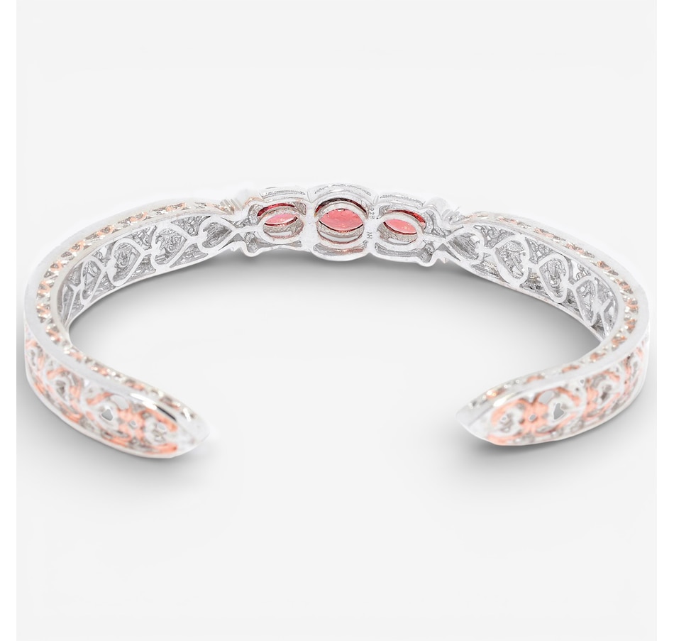 Elegant and feminine, this Gems en Vogue cuff showcases the warm sparkle of rose zircon in a beautifully balanced trio of faceted ovals. Crafted in palladium silver with rich rose gold and rhodium plating, it slips on with ease for a refined, comfortable fit. This glowing statement piece can add soft colour and artisanal craftsmanship to any look!