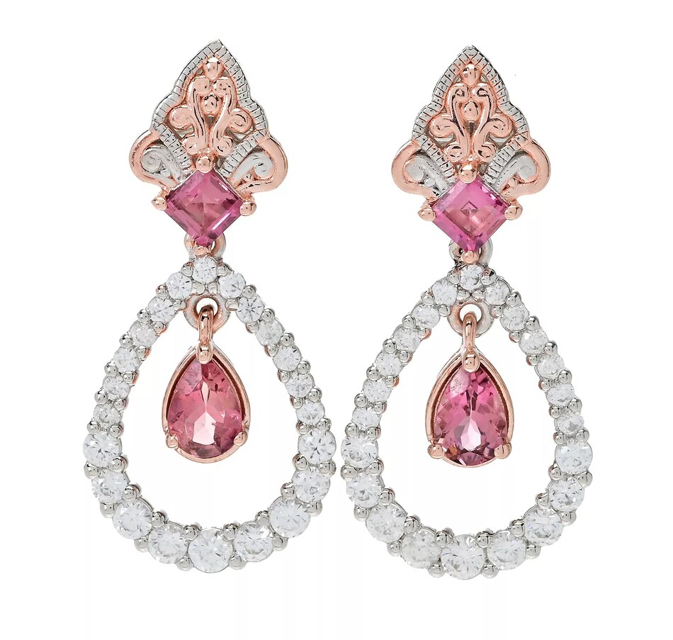 • (2) 6mm x 4mm pear shape, prong set and faceted pink tourmalines (0.90 av. ctw)