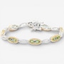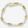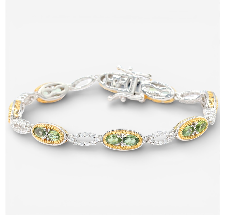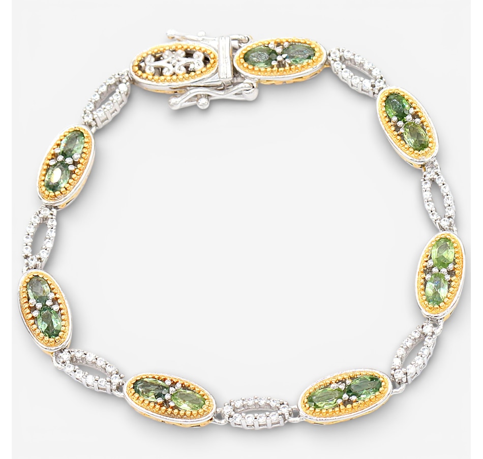 Wrap your wrist in elegance with the Gems en Vogue sapphire and white zircon Bracelet. Featuring 14 faceted green sapphires in a classic oval cut and accented by 70 sparkling white zircons, this piece delivers a combined 6.30 carats of brilliance. Crafted in durable palladium silver with luxurious 24K yellow gold plating and white rhodium accents, it offers a sophisticated two-tone finish that elevates any look. Measuring approximately 7" in length and secured with a box-and-tongue clasp plus two safety clips, this bracelet combines beauty with peace of mind. A timeless design that blends vibrant colour and dazzling sparkle, perfect for special occasions or everyday luxury.