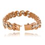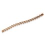 The outside, on both the top and bottom, presents curved rose gold half moon shaped links that span in an arched wave fashion flowing in opposite directions. These links are attached, via pin, to the next link situating the triangular links through the middle.