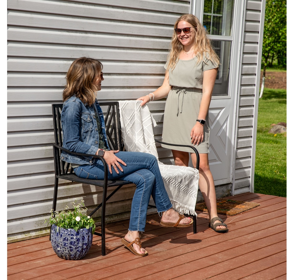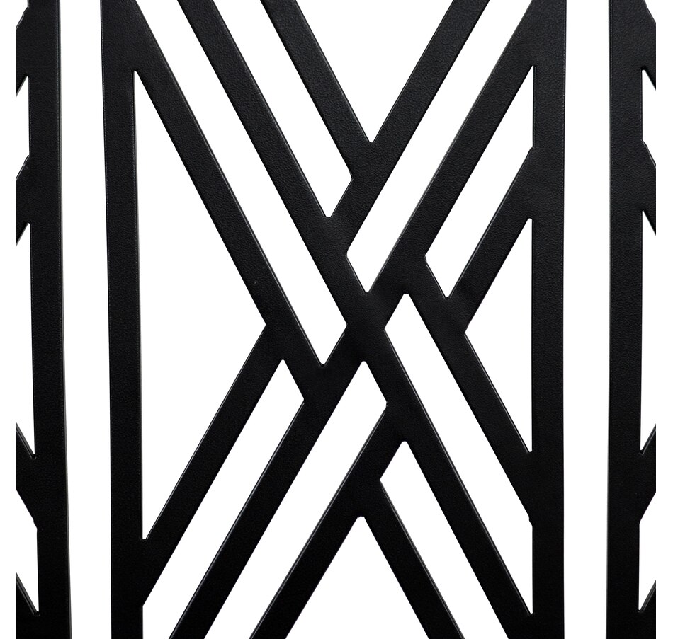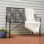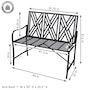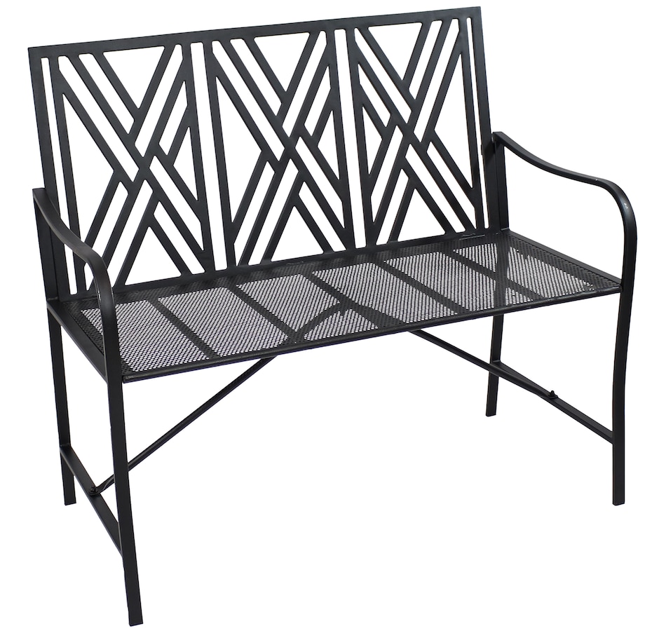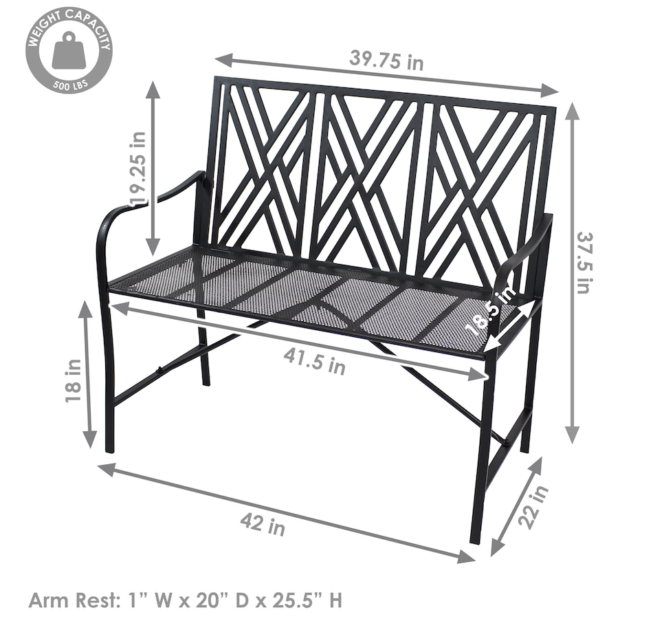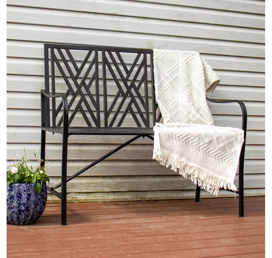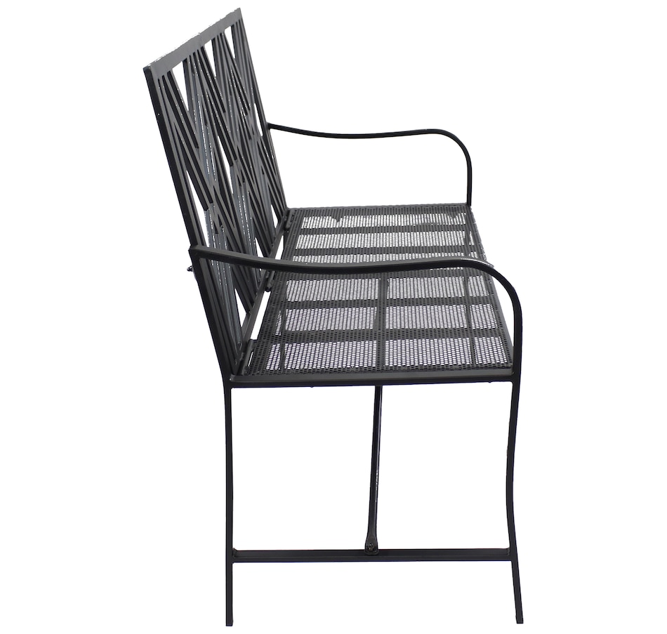 Relax and enjoy a warm, sunny day in the garden or a cool, star-filled evening by the fire on this 2-person black metal outdoor bench. With a decorative geometric lattice pattern on the backrest and a sleek black finish, this metal garden bench is sure to add a beautiful, modern touch to any outdoor setting. Place the bench on the deck, patio, or porch to offer seating to guests, or surround it with bright flowers in the garden. The bench also makes a great addition around the fire pit in the backyard or at the cabin. Made from durable iron with a powder-coated finish, the outdoor patio bench is built to withstand most mild weather conditions. With a weight capacity of 500 lbs, the seat is large and strong enough to accommodate 2 people. Assembling this outdoor bench is a breeze. Unfold the seat and back, attach the sides and support rods, and it's ready for use.
