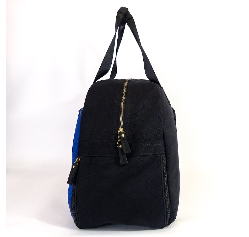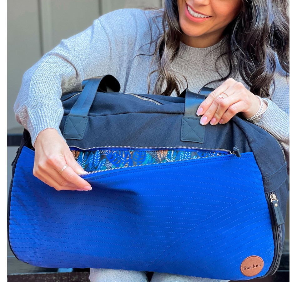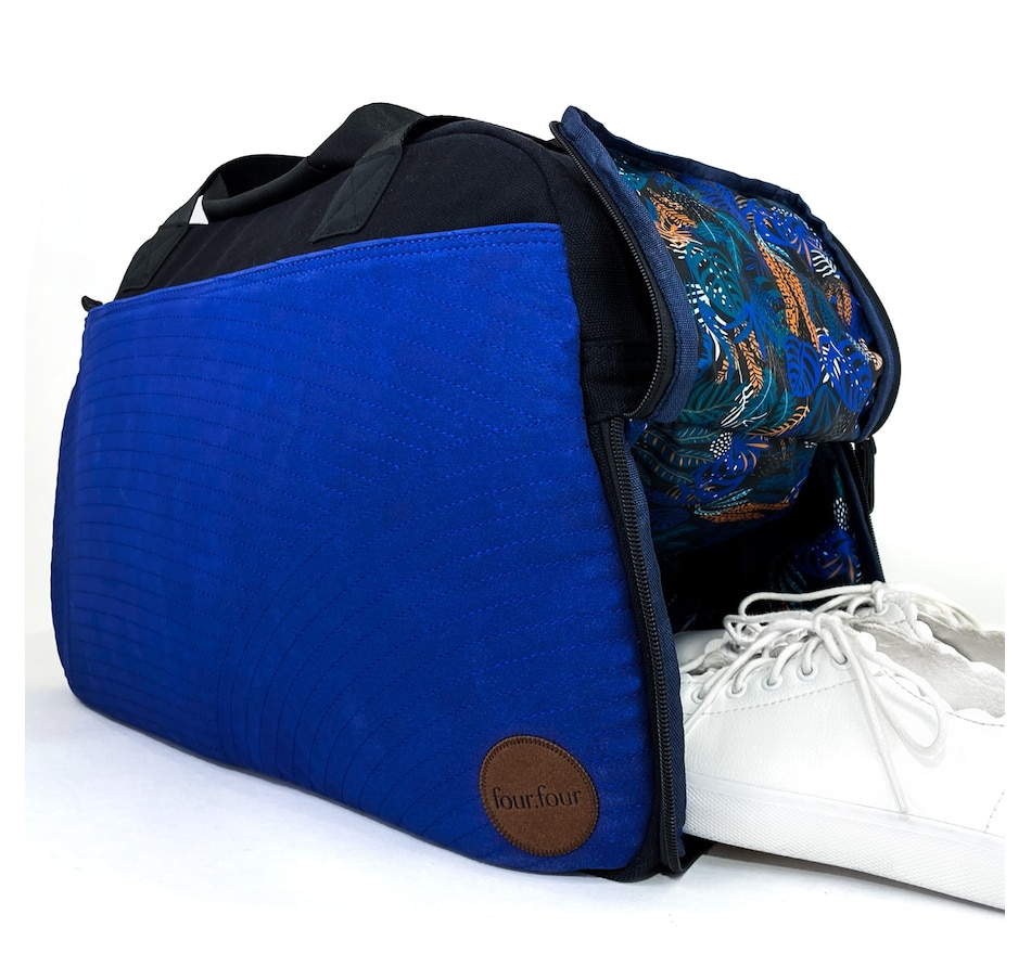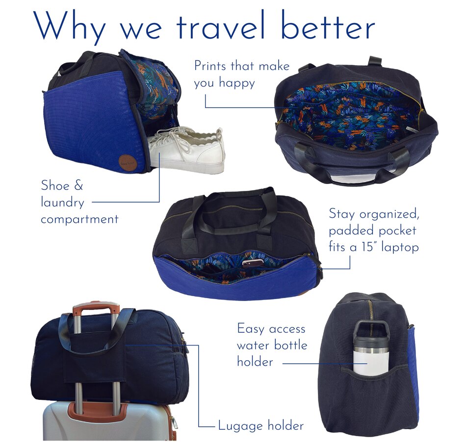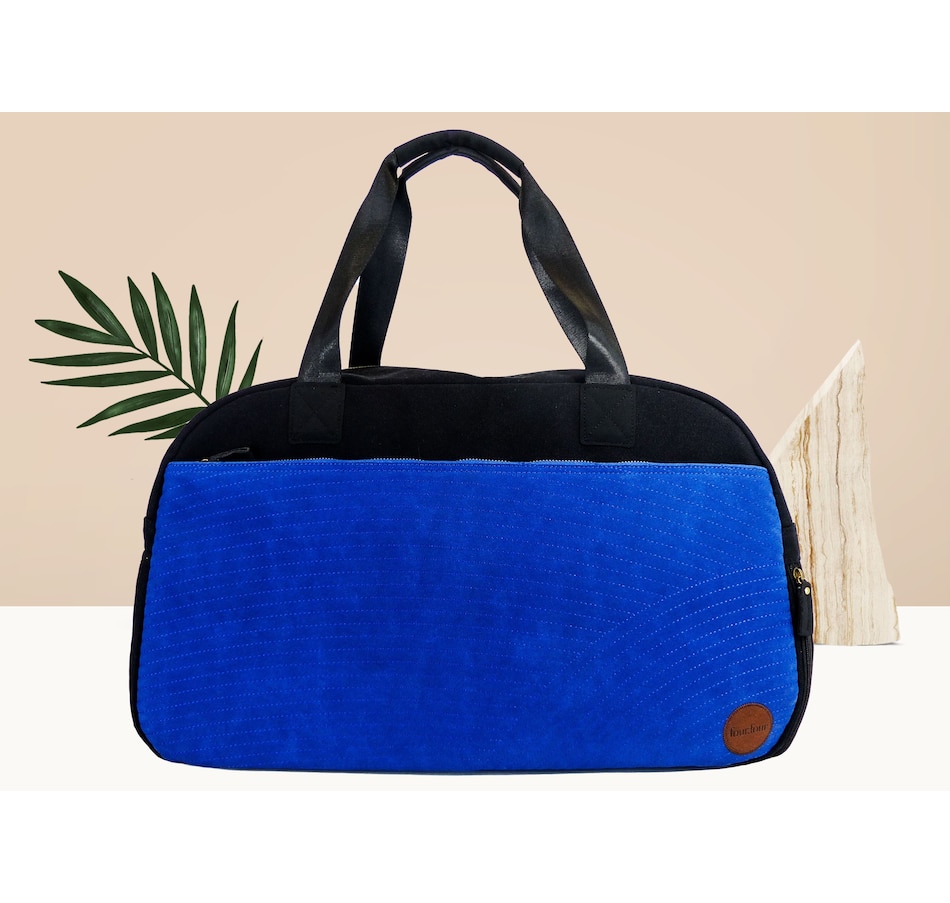 Your browser does not support our video. Introducing the Getaway Duffel Bag - Eternal Optimist Cobalt Blue, merging style, practicality, and ease for all travel. Crafted with California-inspired flair, it offers streamlined compartments, a shoe/laundry section, cute interior print, water bottle holder, and a luggage sleeve. Compact for overhead bins, machine washable. Ideal for any trip.Why You'll Adore It:With its innovative design, this canvas duffel bag streamlines your travel experience. Its carefully crafted compartments keep you organized on the go, including a spacious side section for shoes or laundry, a water bottle holder, and multiple interior pockets. It also features a luggage sleeve that easily attaches to most rolling luggage, and its compact size fits neatly in the overhead bin of most major airlines. The Getaway Duffel is also machine washable for easy maintenance. Ideal for weekend trips, extended vacations, or even just a day at the gym.Efficient Organization: Say goodbye to clutter and chaos. Fabric & Care:100% Cotton Canvas (Exterior)100% Faux Vegan Suede (Exterior)100% Polyester (Interior)Eternal Optimist Blue (Color)Machine wash cold, tumble dry on low heat.Size:21"W x 8"D x 13"H33 Liters2 lbsGive.One.Back™ program.