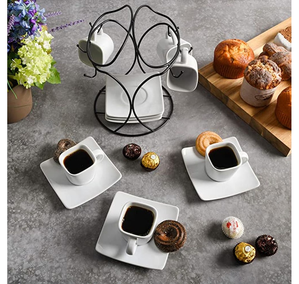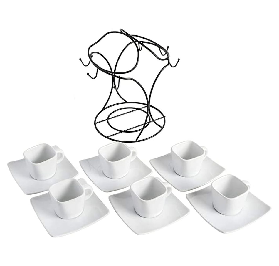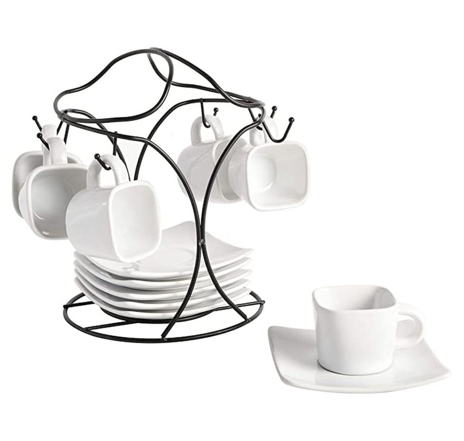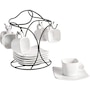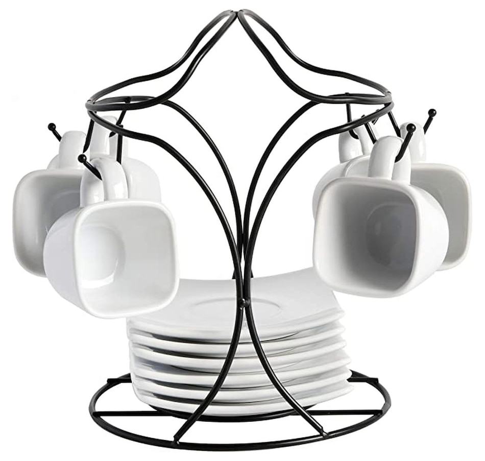 Perk up your morning and your serving style with the Gracious Dining 6-cup espresso set with an accompanying metal rack. These fine ceramic pieces are a gorgeous addition to any existing gracious dining whiteware collection, or as a standalone way to drink the best coffee around. Each cup comes with a beautiful saucer and they all fit snugly together in the chic and stylish matt metal rack which is perfect for easy access and storage.