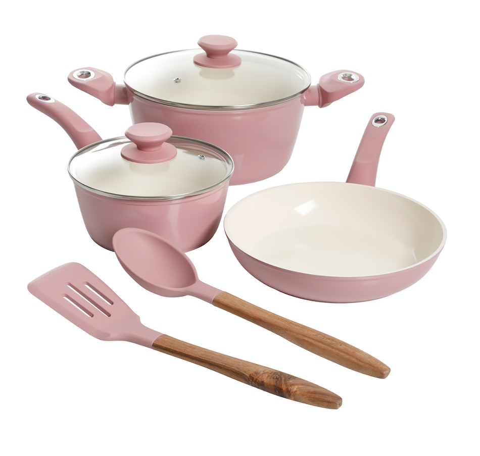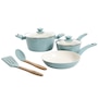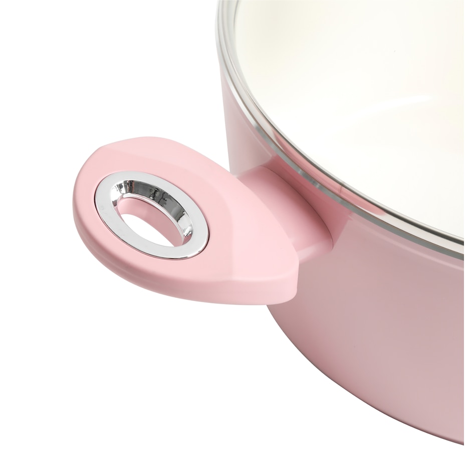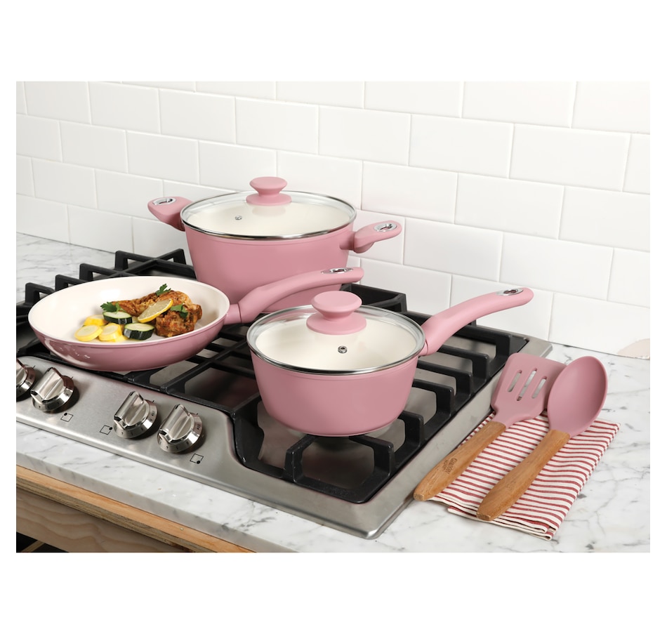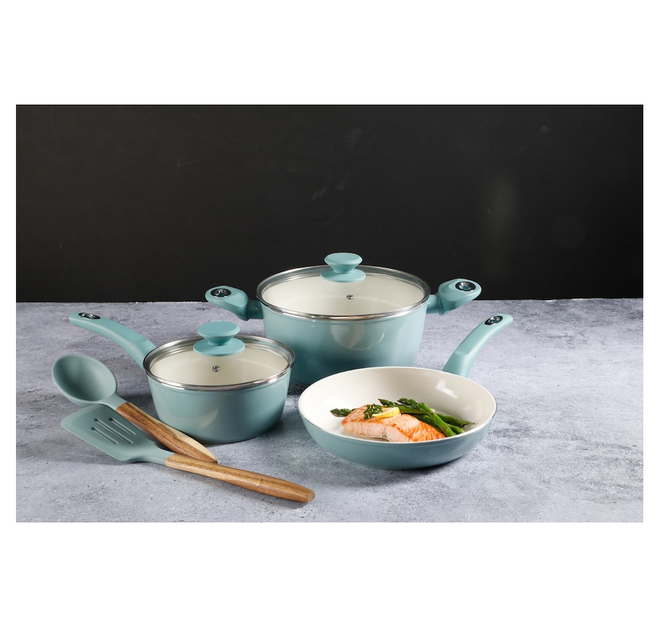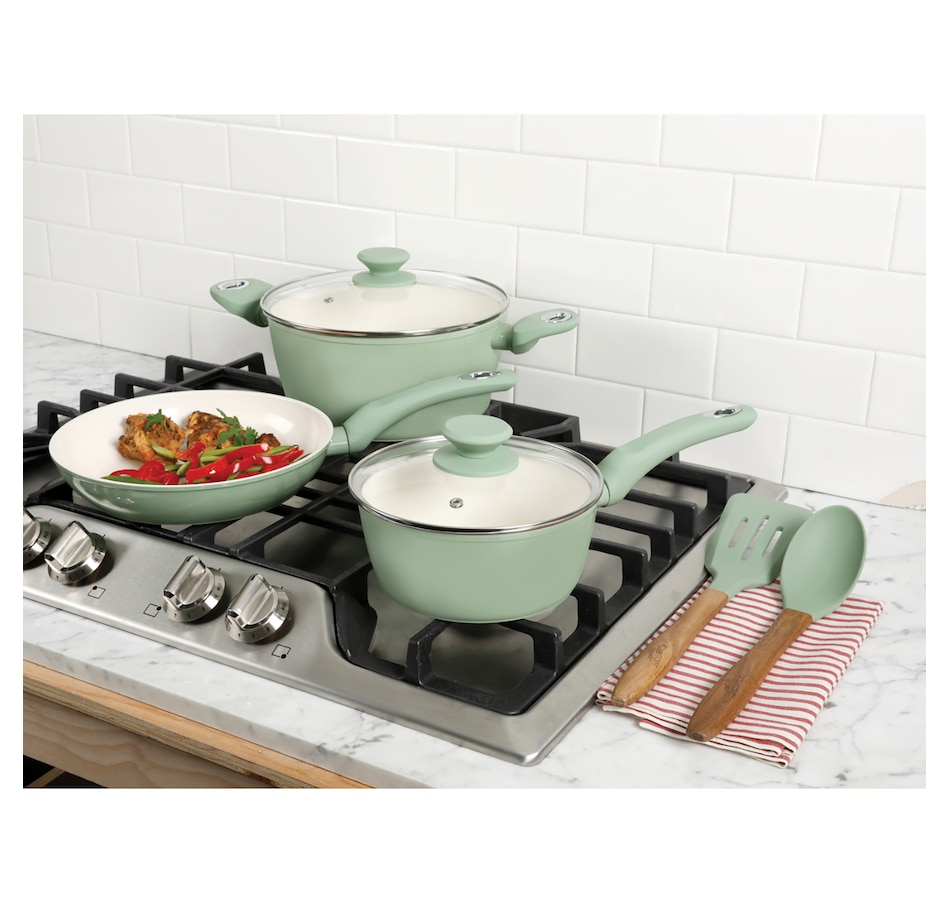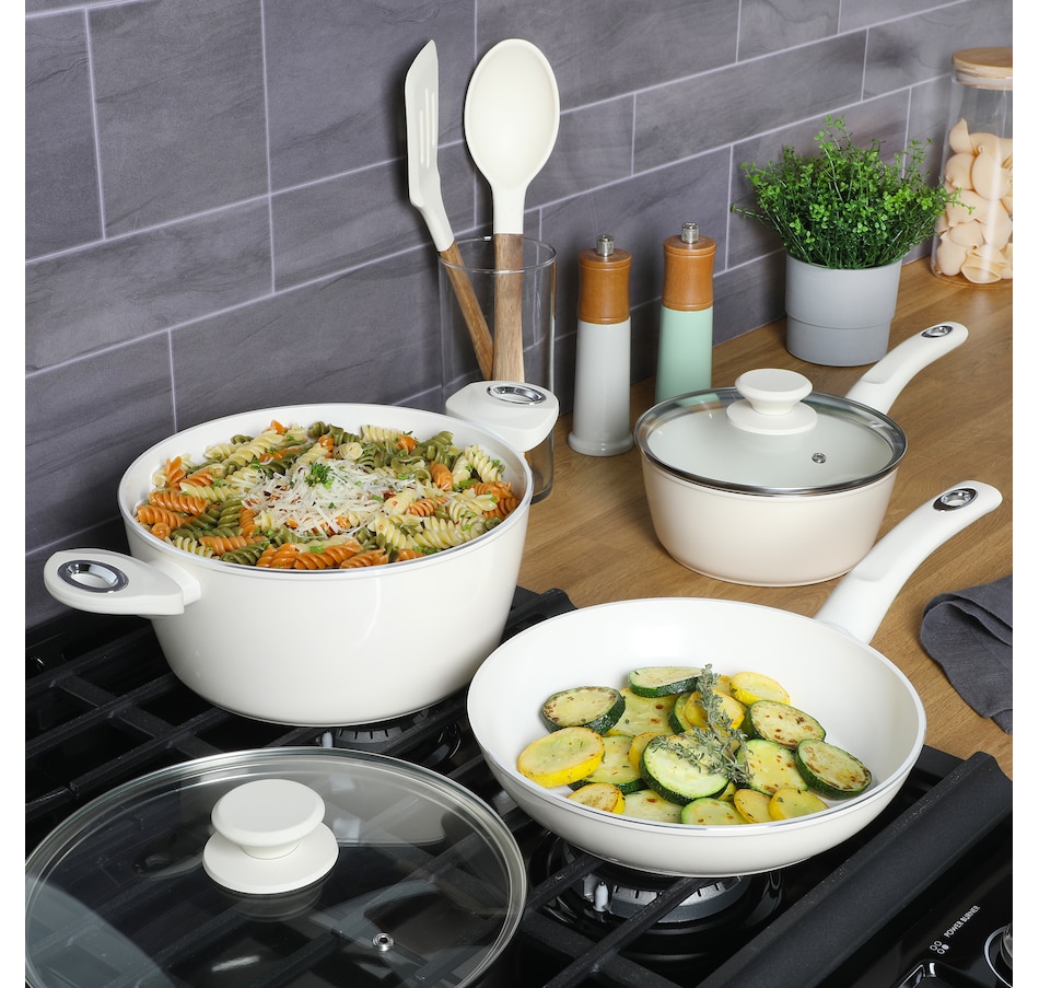 Whether you're an expert cook or just learning the ropes, this complete Plaza Cafe cookware set has everything you need for creating delicious meals. Made from durable forged aluminum, this suite of kitchen essentials heats quickly and evenly, eliminating hotspots that burn food. Its long-lasting nonstick interiors release food effortlessly and clean up easily, ideal for eggs and other sticky foods. Use the generously sized Dutch oven to braise, simmer, and stew. Available in a full spectrum of on-trend colours that will enhance your home, the off-white nonstick interiors allow you to easily tell if food is burning. The soft-touch riveted handles provide sturdy comfortable grips for confident pouring.