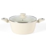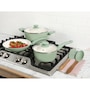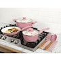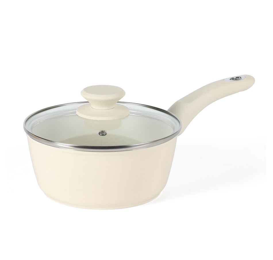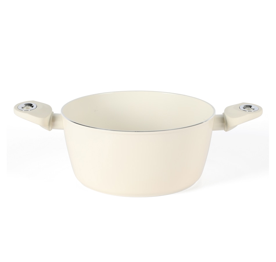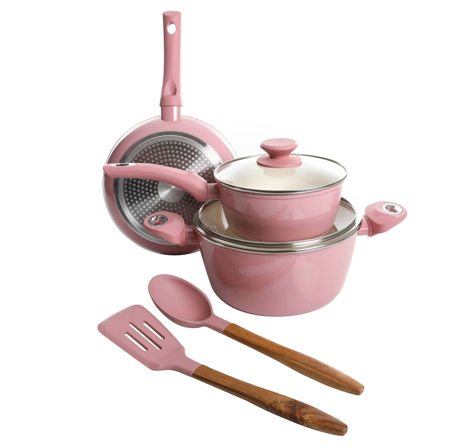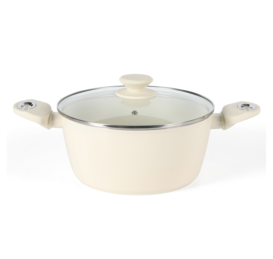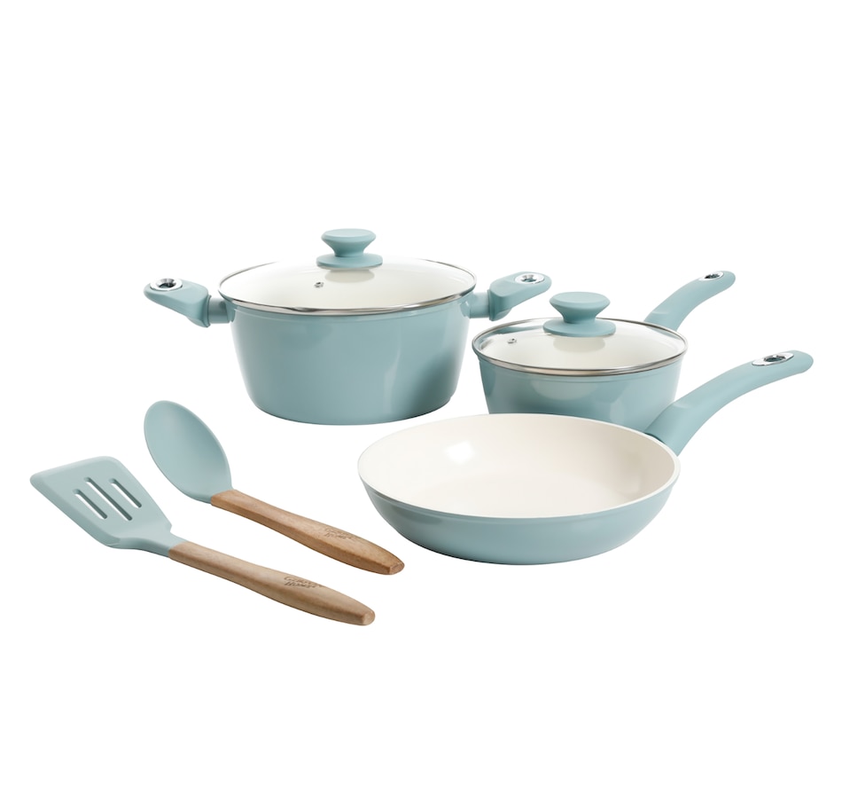 Whether you're an expert cook or just learning the ropes, this complete Plaza Cafe cookware set has everything you need for creating delicious meals. Made from durable forged aluminum, this suite of kitchen essentials heats quickly and evenly, eliminating hotspots that burn food. Its long-lasting nonstick interiors release food effortlessly and clean up easily, ideal for eggs and other sticky foods. Use the generously sized Dutch oven to braise, simmer, and stew. Available in a full spectrum of on-trend colours that will enhance your home, the off-white nonstick interiors allow you to easily tell if food is burning. The soft-touch riveted handles provide sturdy comfortable grips for confident pouring.