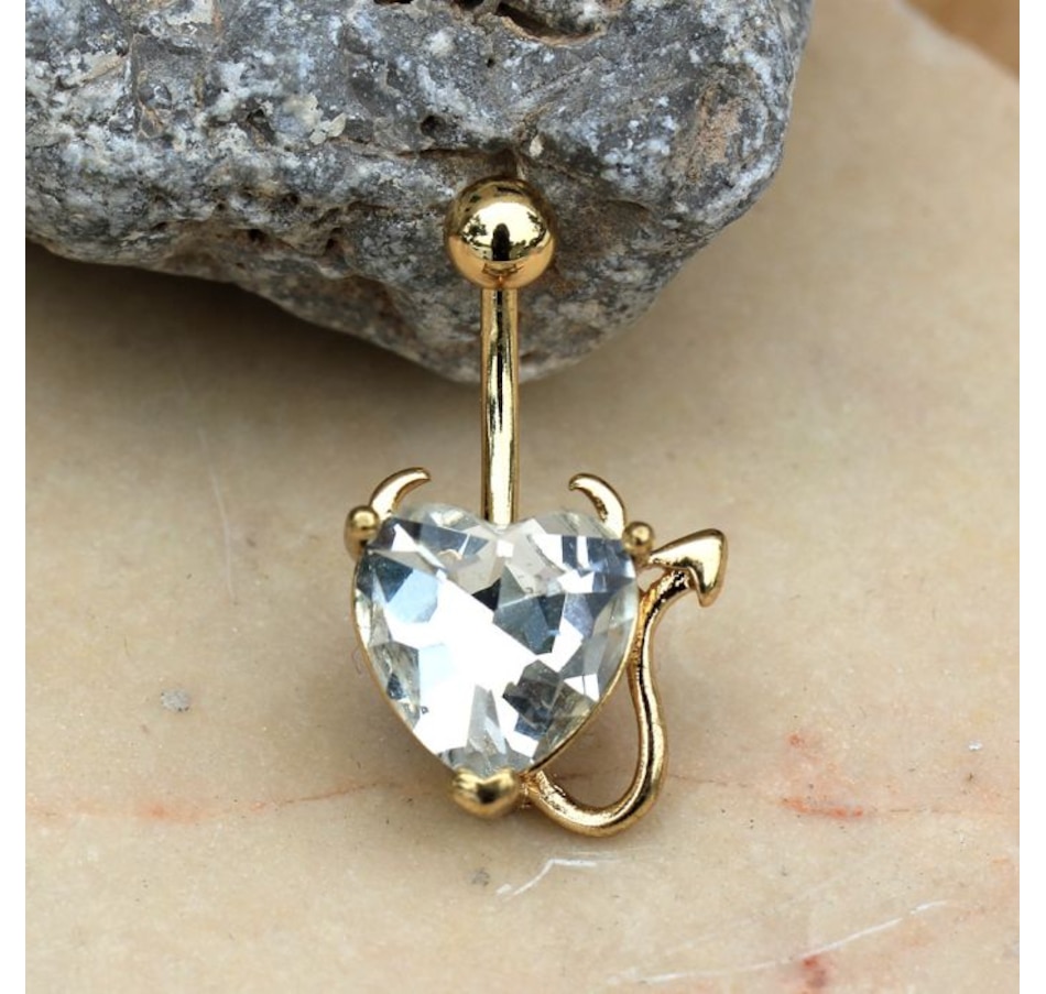 Navel Ring / Belly Button Ring with a Devil's Heart Design‚Heart shaped Clear CZ‚Devil's horns and tail‚Bar Thickness : 14GA | 1.6mm‚Bar Length : 3/8" | 10mm‚Total Jewelry Size : 16.5(L) x 30(W)mm‚Thread Type : Externally Threaded‚Material : Gold Plated 316L Stainless Steel, Gold Plated Zinc Alloy, Cubic Zirconia