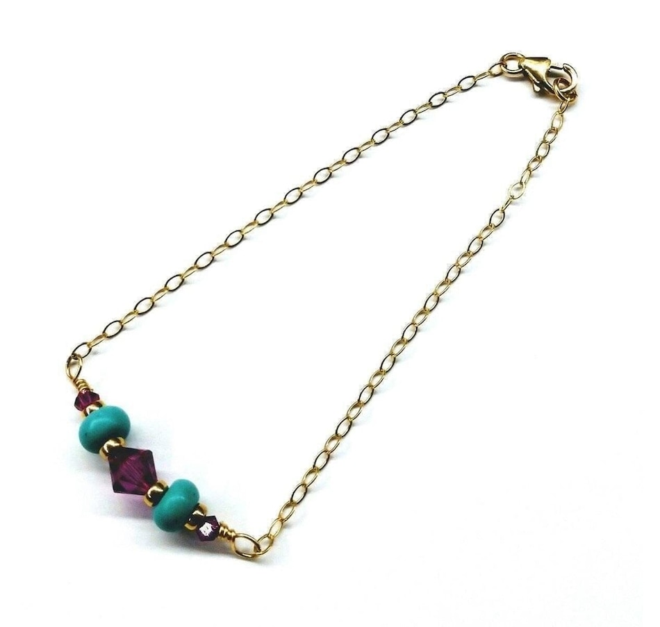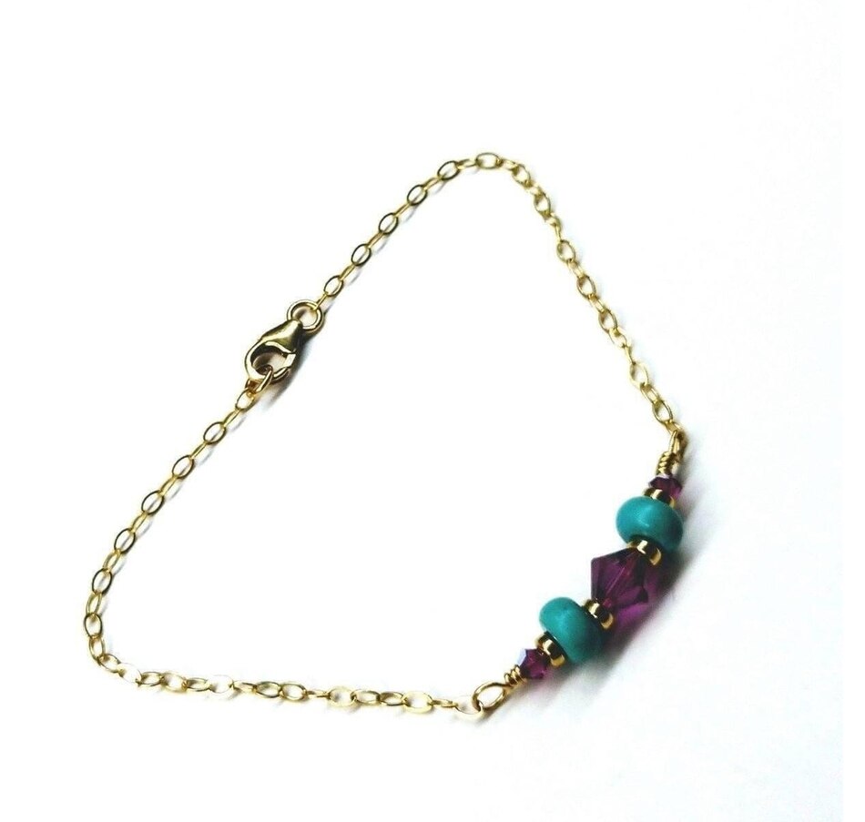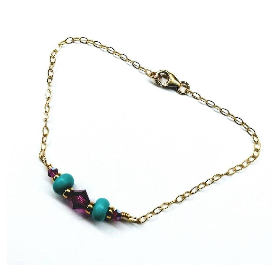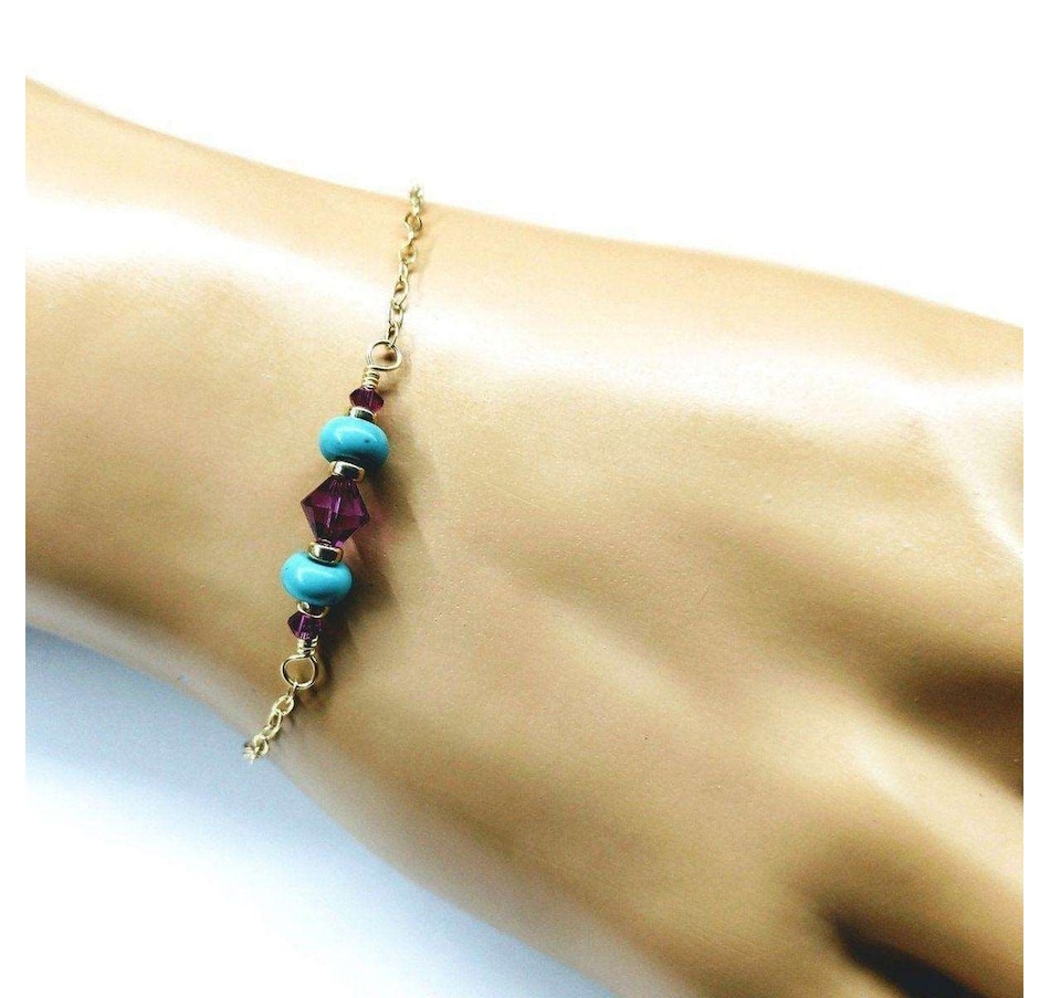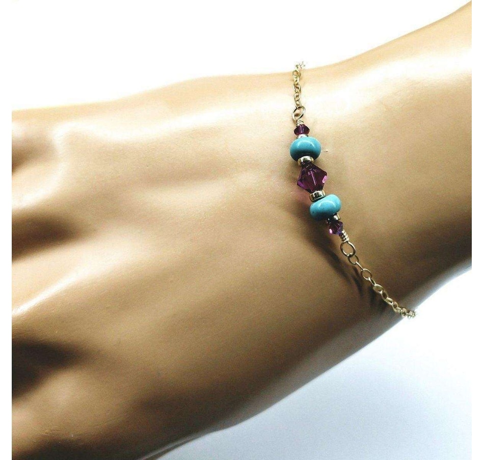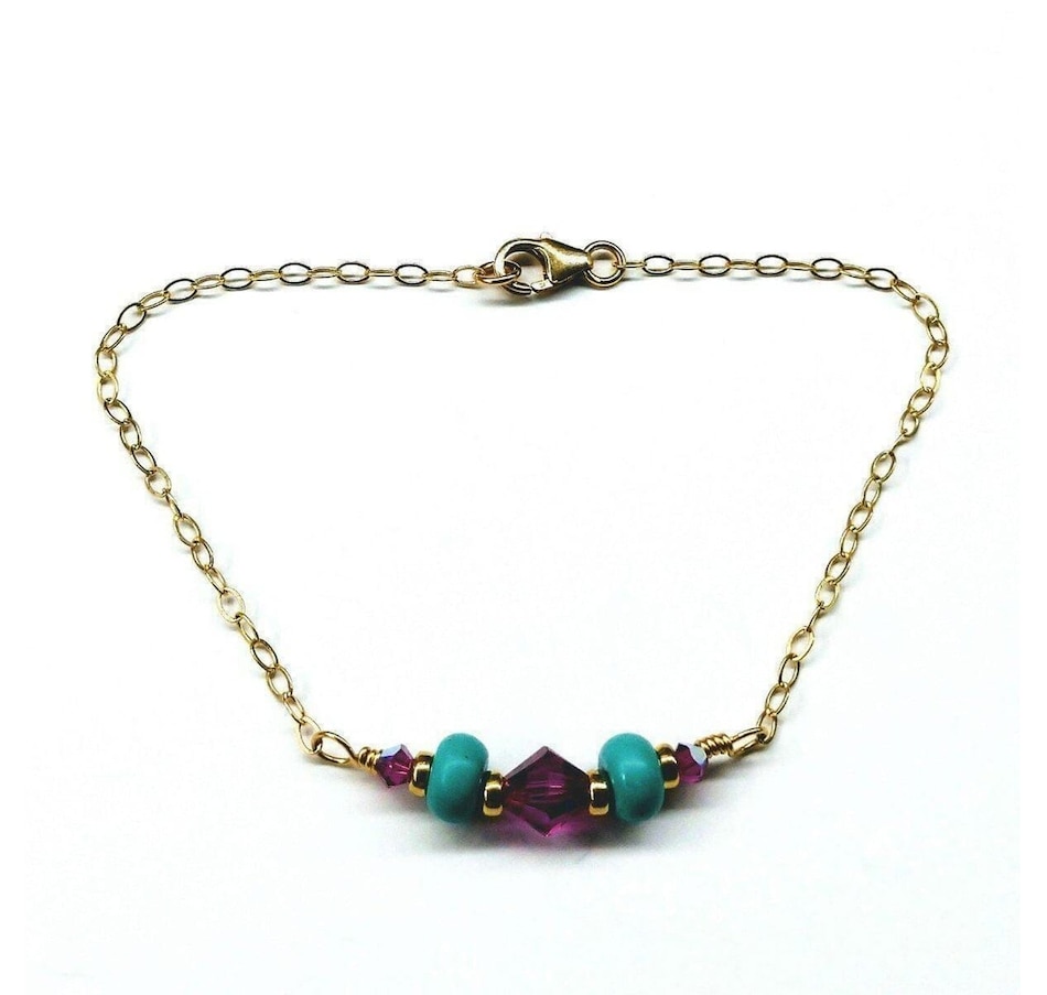 Experience the luxury of this gorgeous, handcrafted 14 k gold filled bracelet, elegantly adorned with wire-wrapped turquoise and fuchsia! Intricately linked, a stunning 14K gold filled flat cable chain brings the middle piece to life!14 KT Gold Fill Beads, 9mm Lobster Clasp14 KT Gold Fill Flat Sparkly Cable Chain2 turquoise Heishi beadsFuchsia AB Swarovski crystals 3 and 6 mmSleek Mix and Match Design for all occasionsBracelet length is 7 1/2 inches Made in the USA - Montana