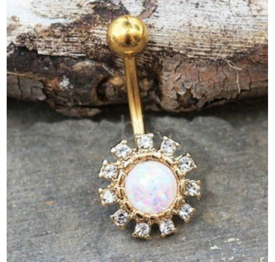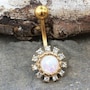 Navel Ring / Belly Button Ring with a Sun design‚Round shaped White Synthetic Opal in the center‚Multiple Clear CZ surrounding the Synthetic Opal‚Yellow gold plated jewelry‚Bar Thickness : 14GA | 1.6mm‚Bar Length : 3/8" | 10mm‚Design Size : 12 x 12mm‚Top Ball Size : 5mm‚Material : Gold Plated 316L Stainless Steel, Gold Plated Zinc Alloy, Cubic Zirconia, Synthetic Opal