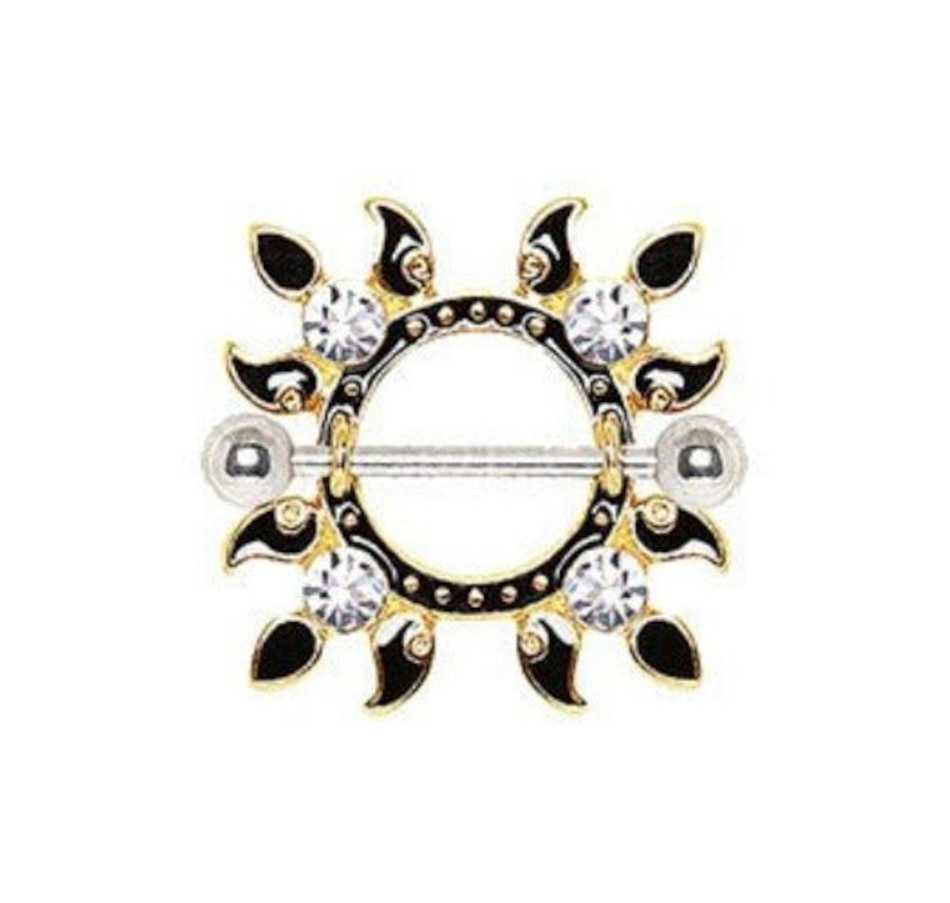 Gold Nipple Jewelry / Nipple Shield with a flaming sun design‚Nipple jewelry features rich Yellow gold plating and Black Enamel‚Four round Clear CZ on the shield‚316L Stainless Steel 14 Gauge straight barbell‚Barbell Thickness : 14GA | 1.6mm‚Barbell Length : 3/4" | 19mm‚Ball Size : 5mm‚Shield Size : 27 x 27mm‚Inner Ring Diameter (Wearable Size) : 1/2" | 12.5mm‚Material : 316L Stainless Steel, Gold Plated Zinc Alloy, Cubic Zirconia, EnamelABSOLUTELY GORGEOUS