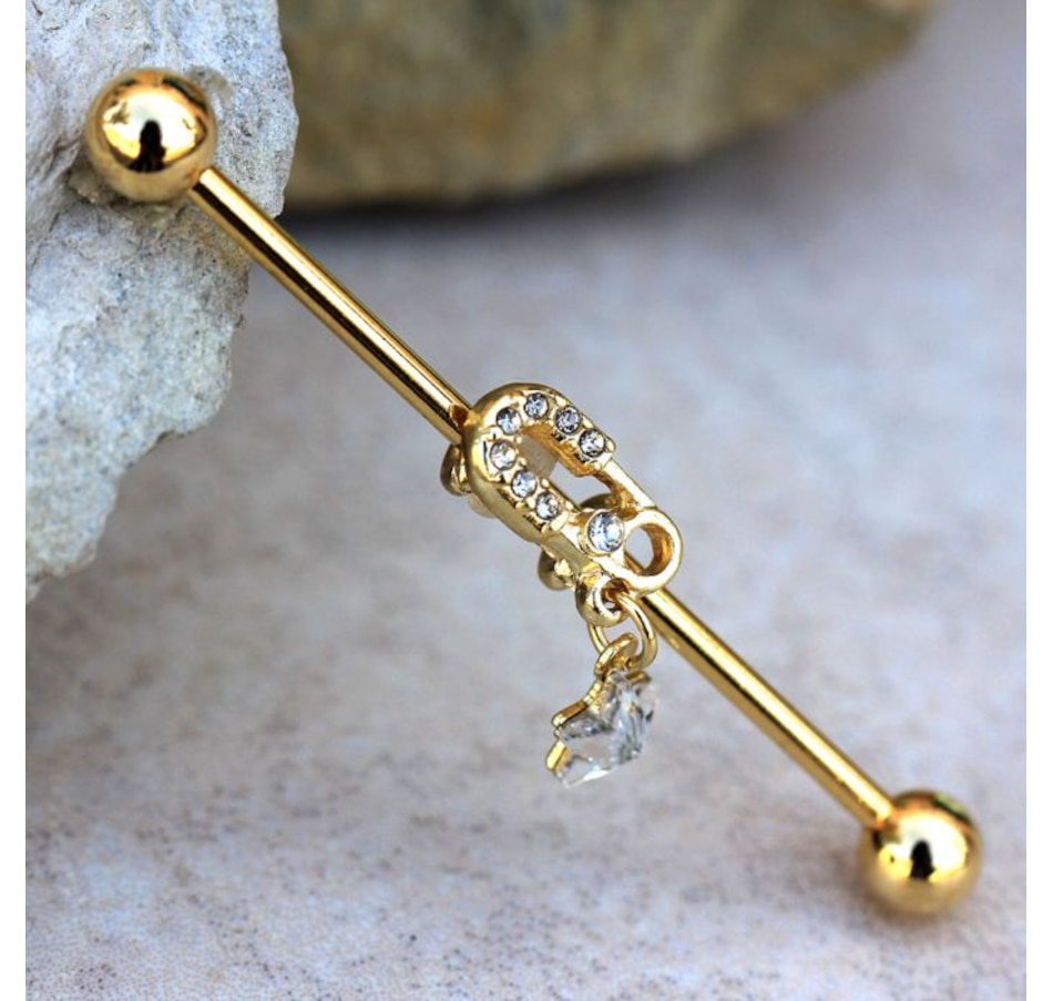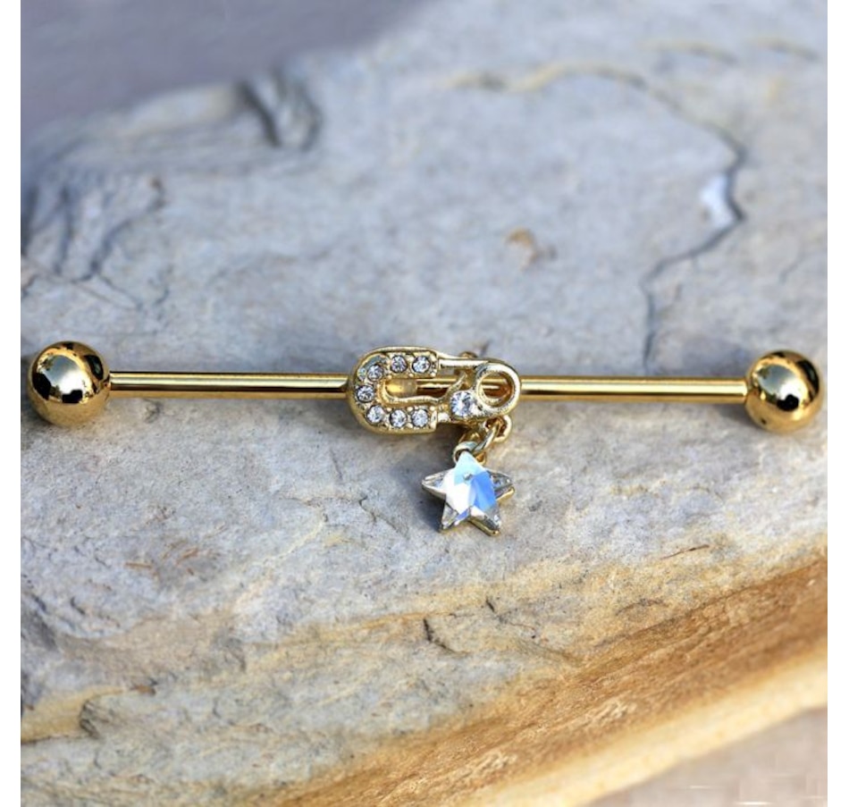Industrial barbell with a Safety Pin & Star Design‚Multiple Clear round CZ on the safety pin design‚Star shaped Clear CZ dangle‚A Clear rubber o-ring to hold the design in a desired position‚Bar Thickness : 14GA | 1.6mm‚Bar Length : 1&1/2" | 38mm‚Butterfly Size : 10(L) x 5(W)mm‚Star Size : 5mm‚Ball Size : 4mm‚Thread Type : Externally Threaded‚Material : Gold Plated 316L Stainless Steel, Gold Plated Zinc Alloy, Cubic Zirconia*Sold in Singles
