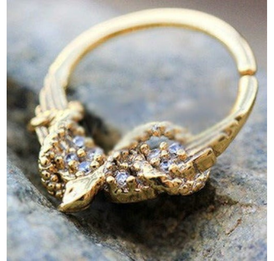 Seamless Ring / Septum Ring with wings and a snake design‚Yellow gold plated Jewelry‚Multiple round Clear CZ on the design‚Easy to open annealed ring‚Ring Thickness : 16GA | 1.2mm‚Ring Inner Diameter : 3/8" | 10mm‚Material : Gold Plated 316L Stainless Steel, Gold Plated Zinc Alloy, Cubic Zirconia‚ *Sold in Singles