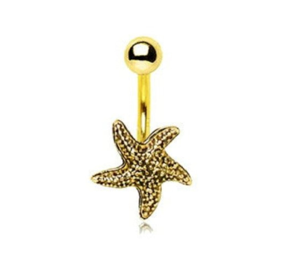 Gold Plated Starfish Navel RingTake the ocean wherever you go with this lovely starfish belly button ring. A detailed gold plated 316L Stainless Steel starfish charm is attached to the navel ring for a simple, elegant look that travels to the beach and beyond. Beautifully designed starfish is 1/2" in diameter.Thickness : 14GA / 1.6mmLength : 3/8‚¬ / 10mmBall Size : 5mmMaterial : Gold Plated 316L Stainless Steel