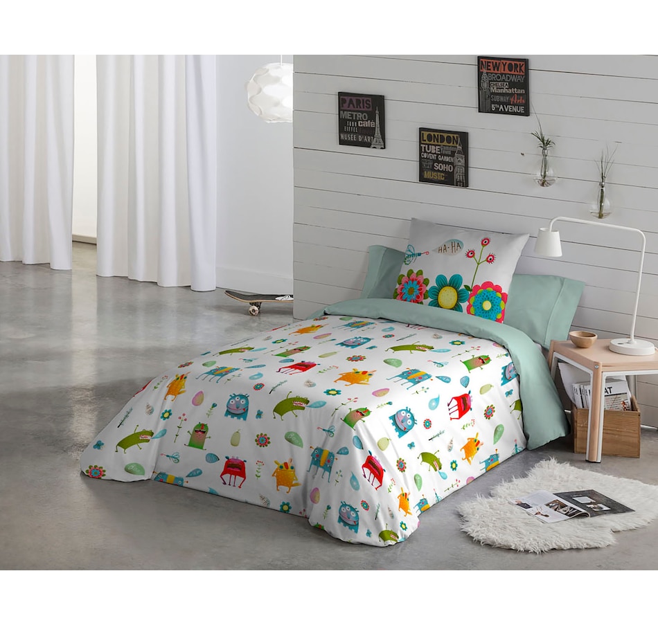 This duvet cover set is digitally printed in Spain. It is reversible from its design to solid colour side, made with a 140 thread count, and 100% oeko-tex certified cotton.