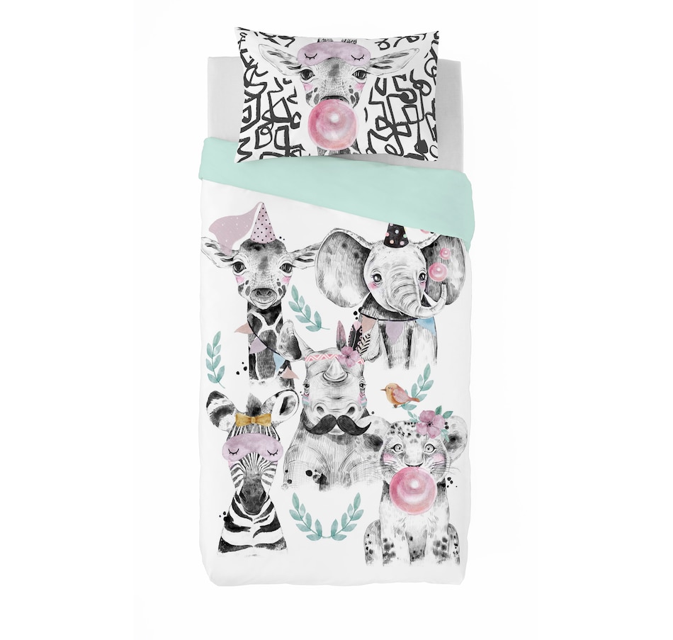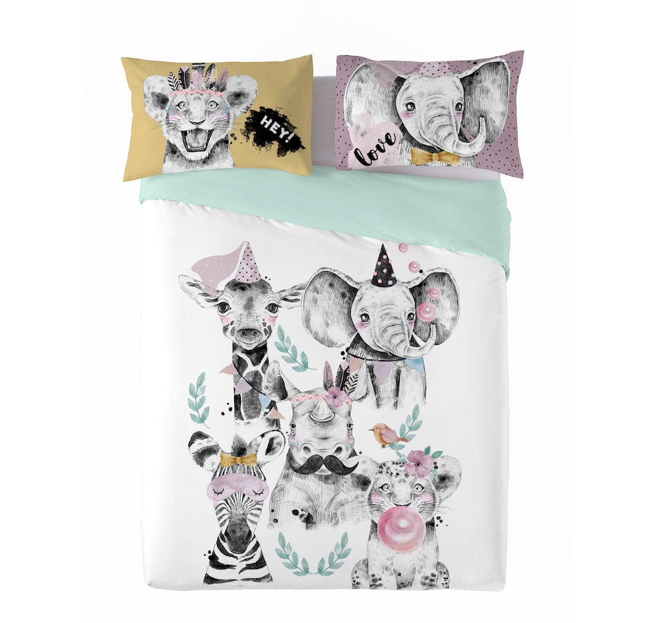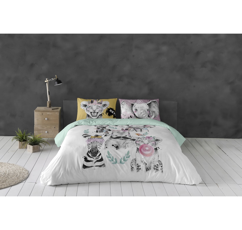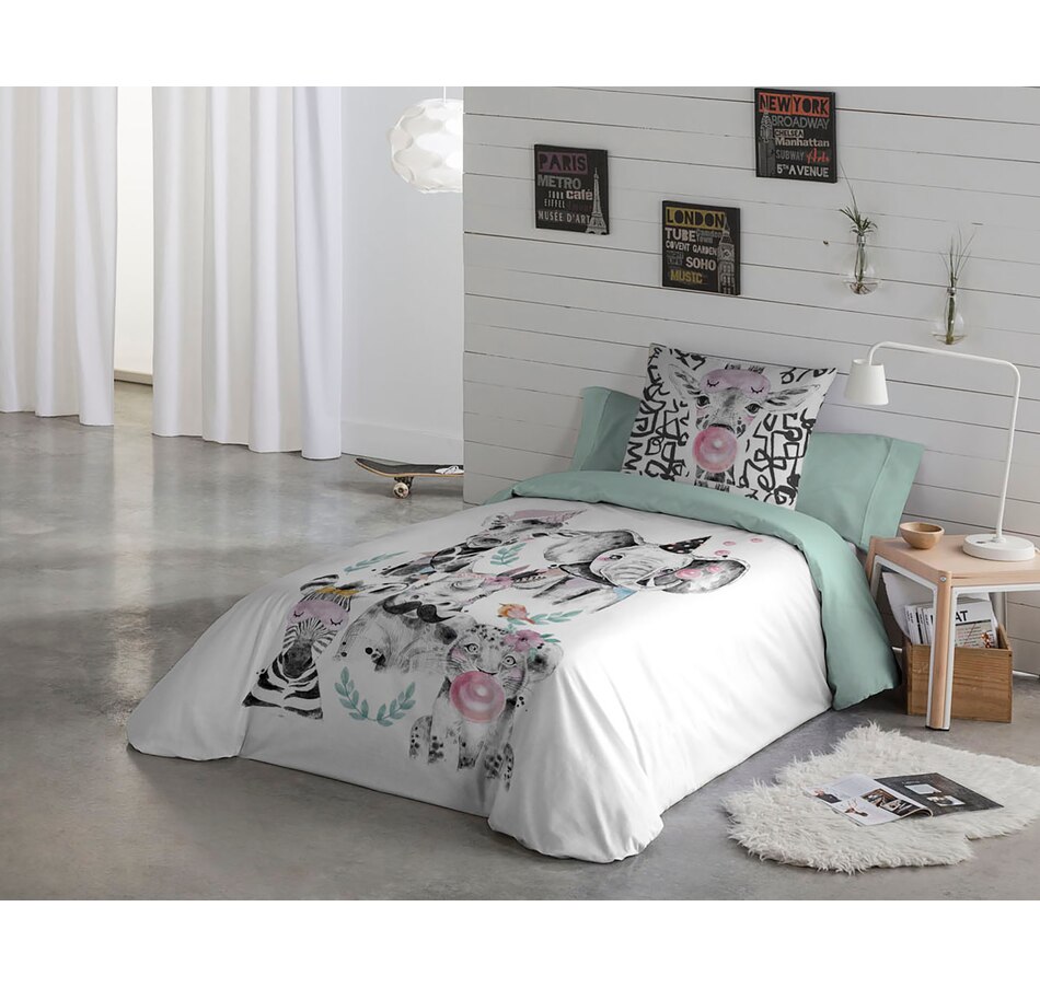This duvet cover set is digitally printed in Spain. It is reversible from its design to solid colour side, made with a 140 thread count, and 100% oeko-tex certified cotton.