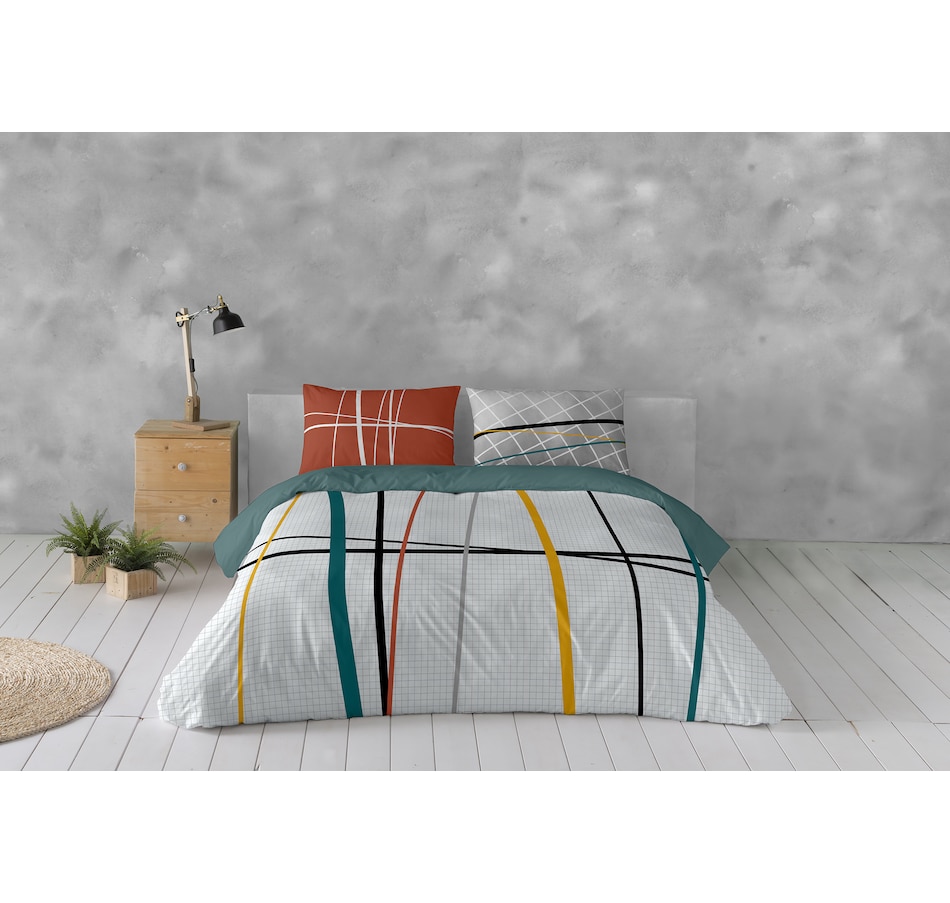 This duvet cover set is digitally printed in Spain. It is reversible from its design to solid colour side, made with a 140 thread count, and 100% oeko-tex certified cotton.
