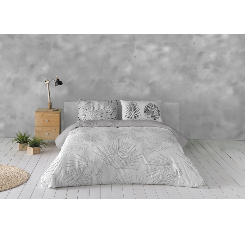 This duvet cover set is digitally printed in Spain. It is reversible from its design to solid colour side, made with a 140 thread count, and 100% oeko-tex certified cotton.