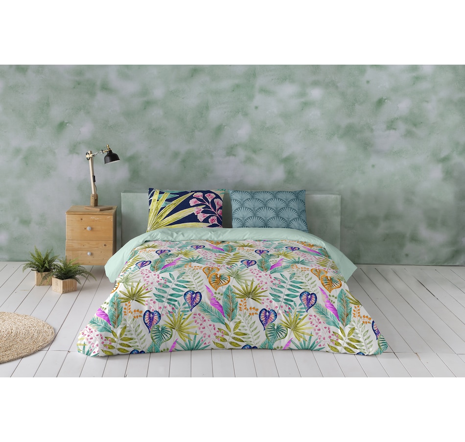 This duvet cover set is digitally printed in Spain. It is reversible from its design to solid colour side, made with a 140 thread count, and 100% oeko-tex certified cotton.