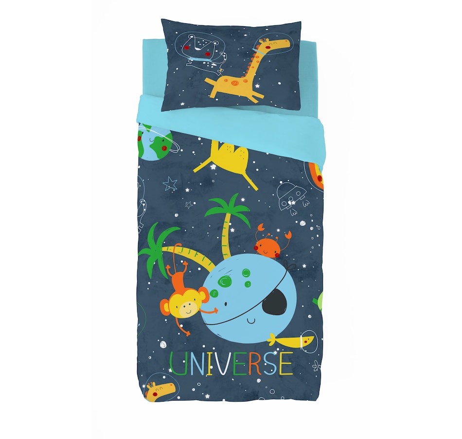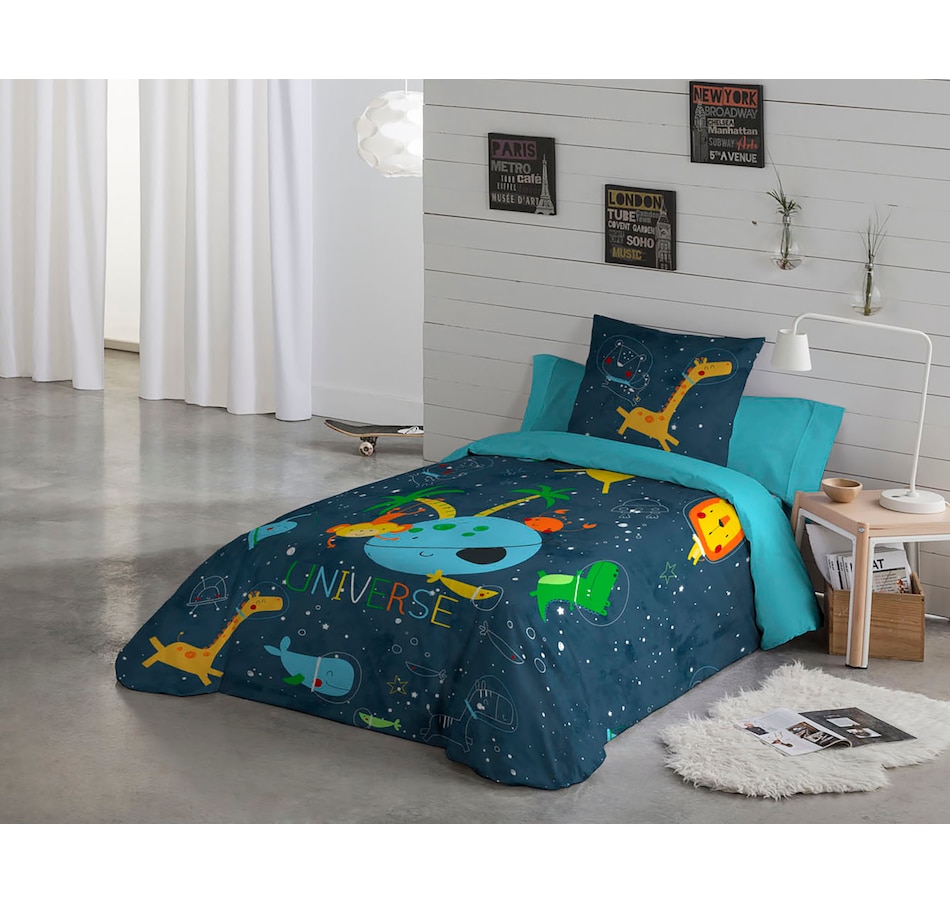 This duvet cover set is digitally printed in Spain. It is reversible from its design to solid colour side, made with a 140 thread count, and 100% oeko-tex certified cotton.