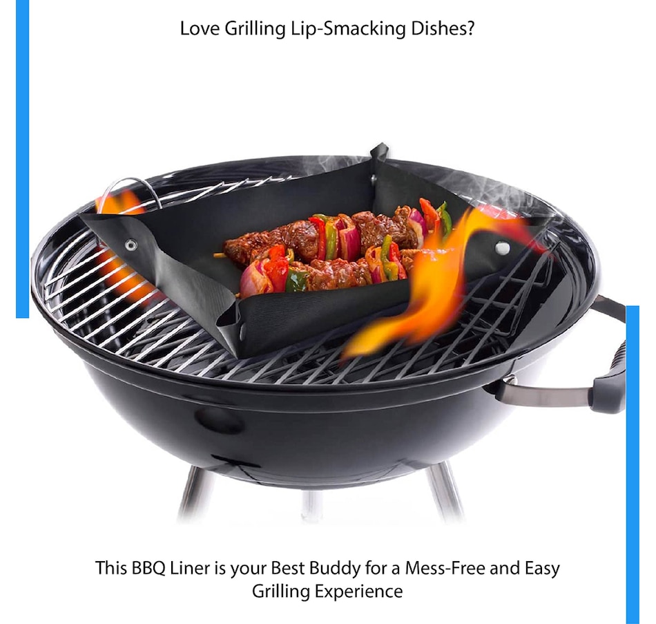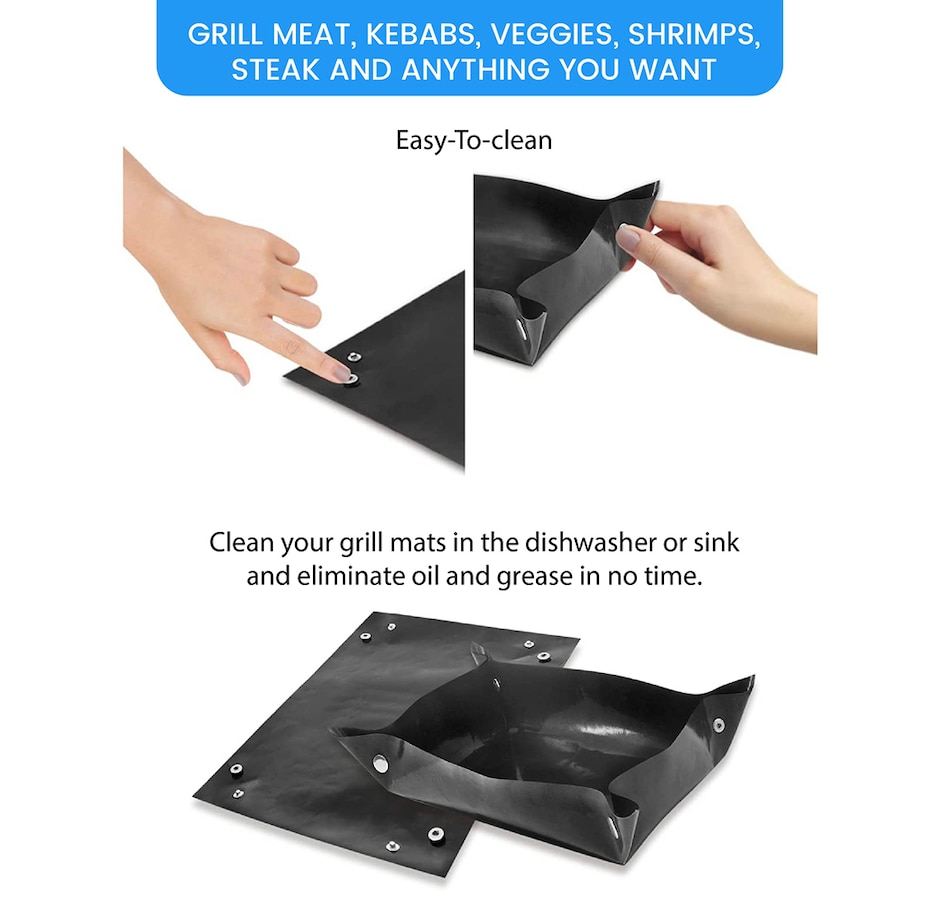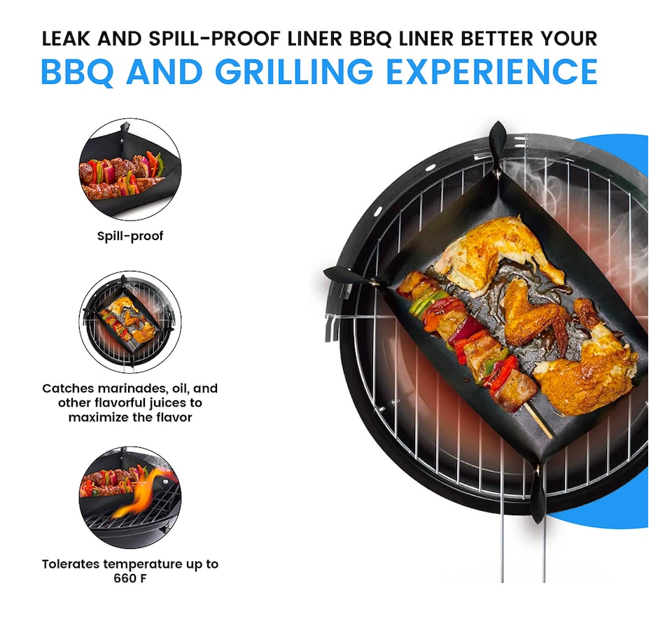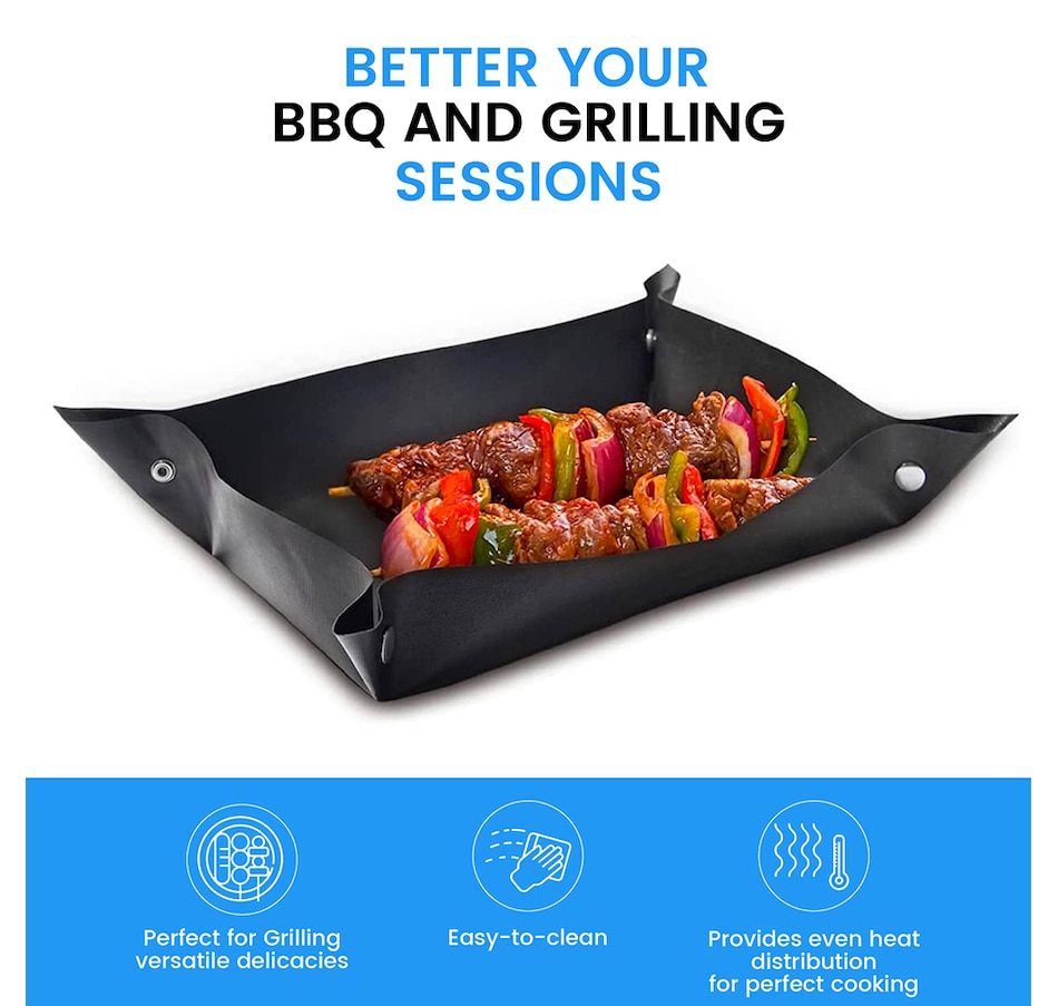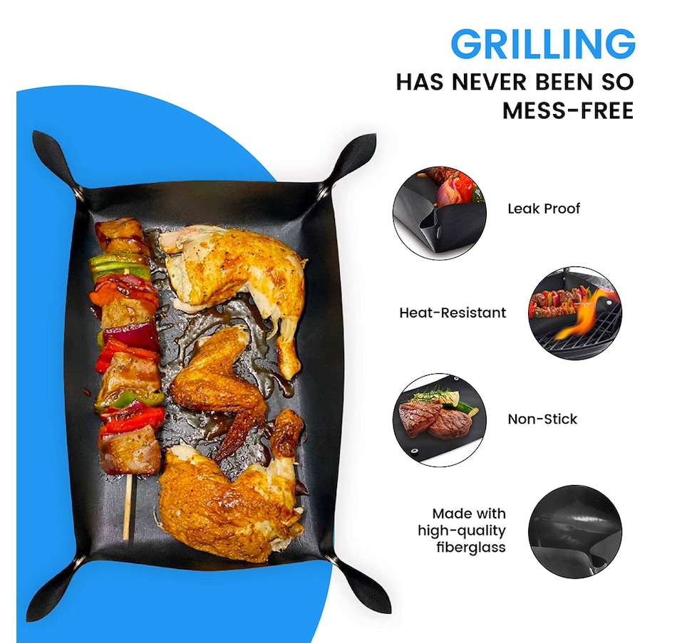 Made with a variety of great features, this BBQ grill mat has heat resistant non-stick liners, and the foldable corners snap to create a leakproof liner for veggies, marinades, and much more.