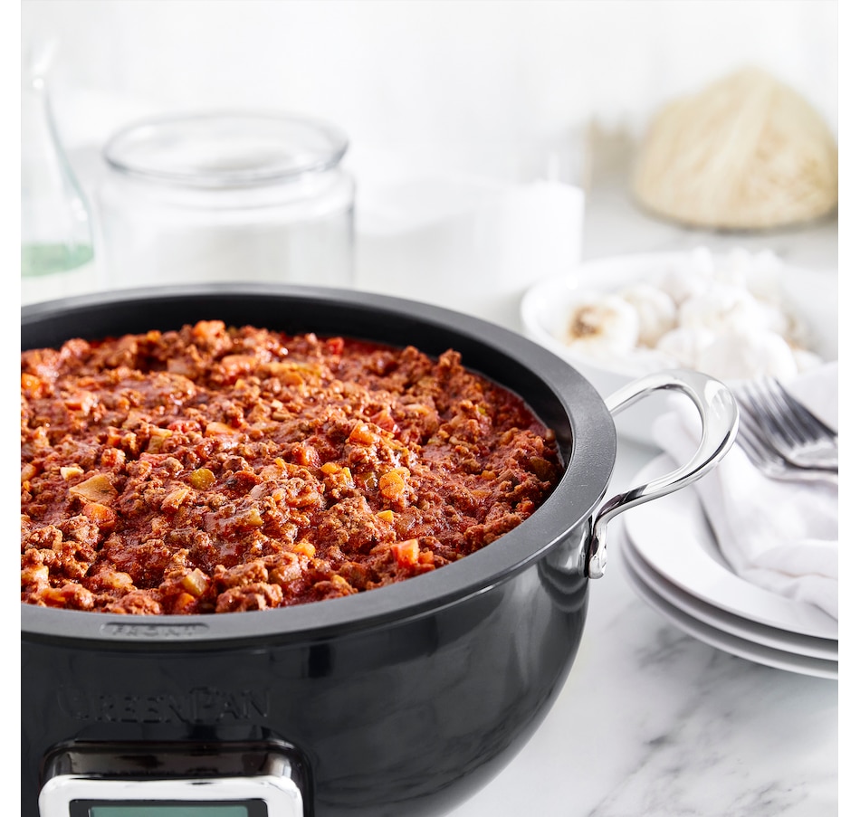 This six-quart electric smart skillet from GreenPan features a die-cast aluminum inner pot, a cast-in heating element for fast heat-up, and a Thermolon Volt ceramic non-stick interior. This non-stick interior is free of PFAS, PFOA, lead and cadmium, so you can create worry-free healthier meals. It offers an easy-to-read backlit LCD display, and 10 modes including stir-fry, sauce, soup, steam, simmer, warm, sear/sauté, white rice, brown rice and grains. You can also use manual operation so you can control the cooking time and temperature as you go. The skillet also features a tempered glass lid to help you keep an eye on your meal and watch the flavours develop, and the heat-resistant base has firm silicone feet to help prevent slipping.