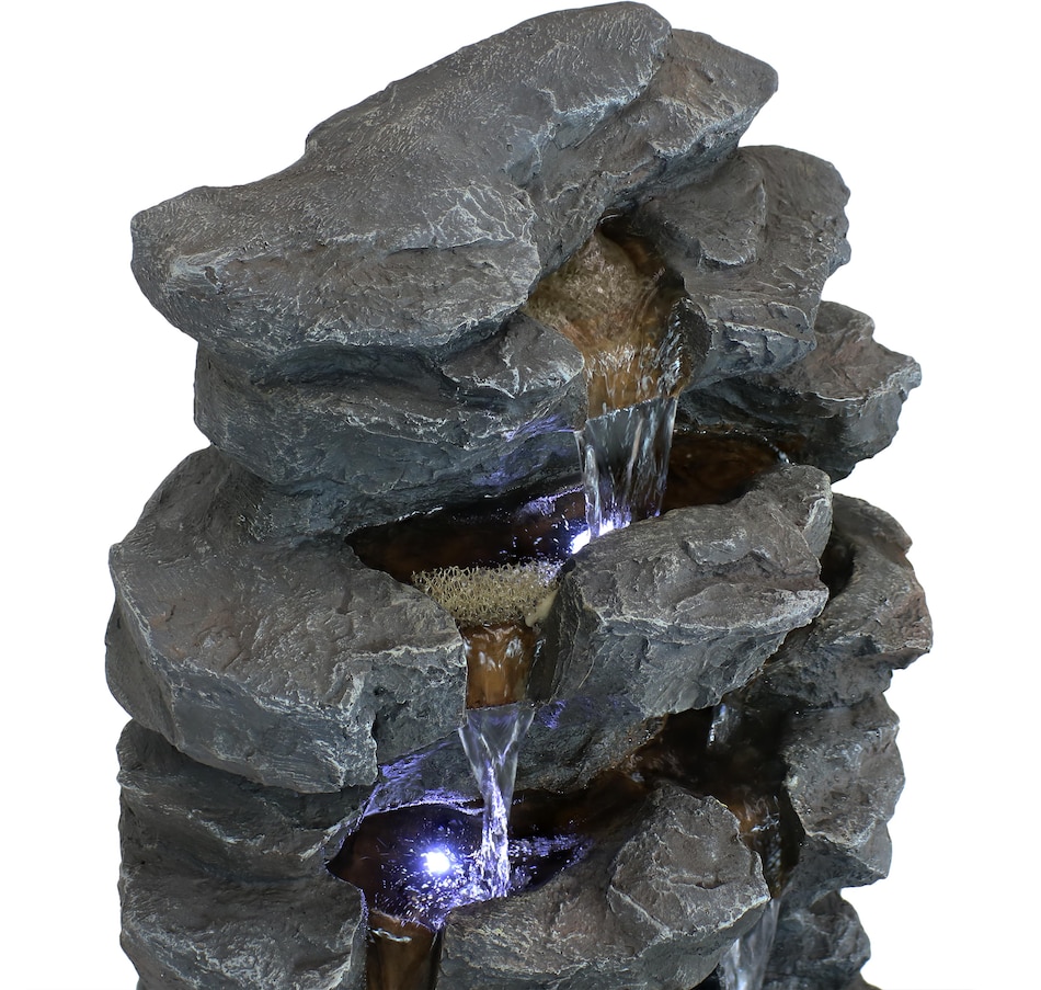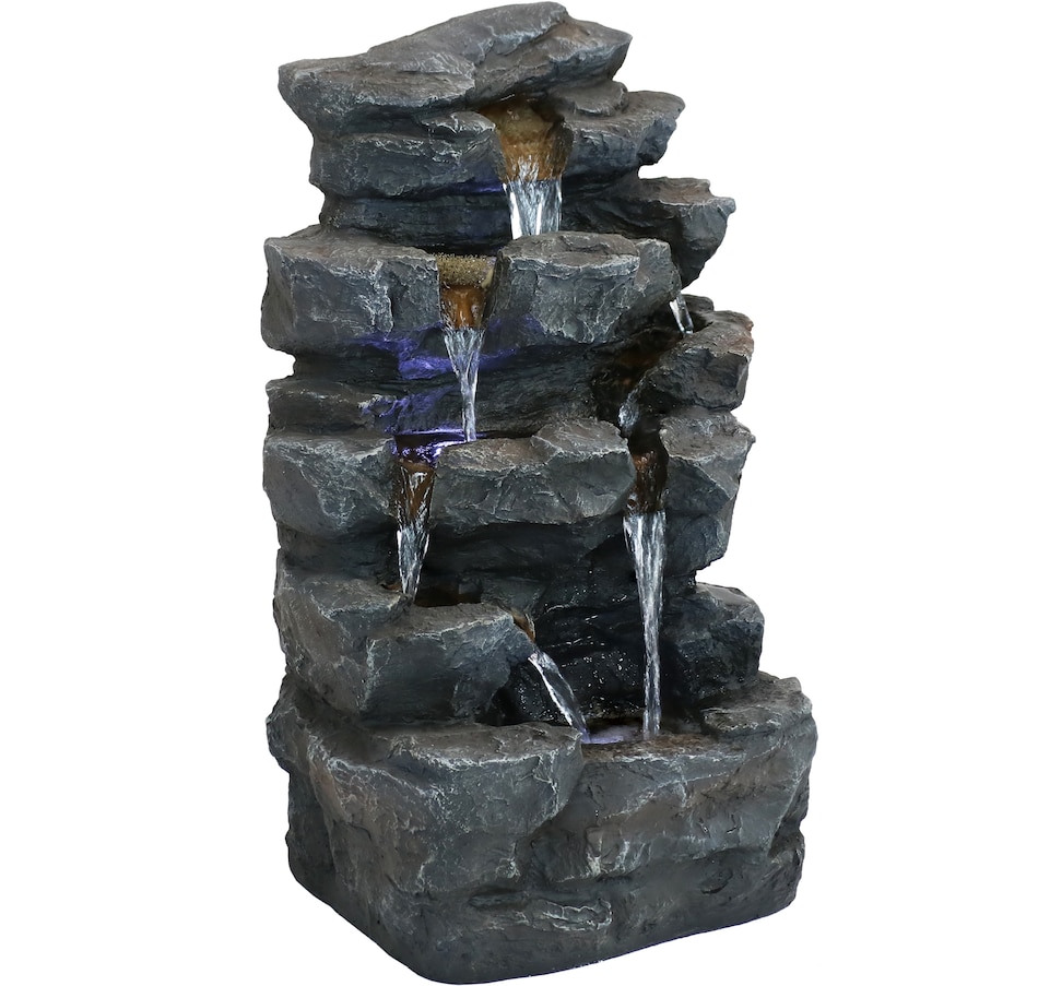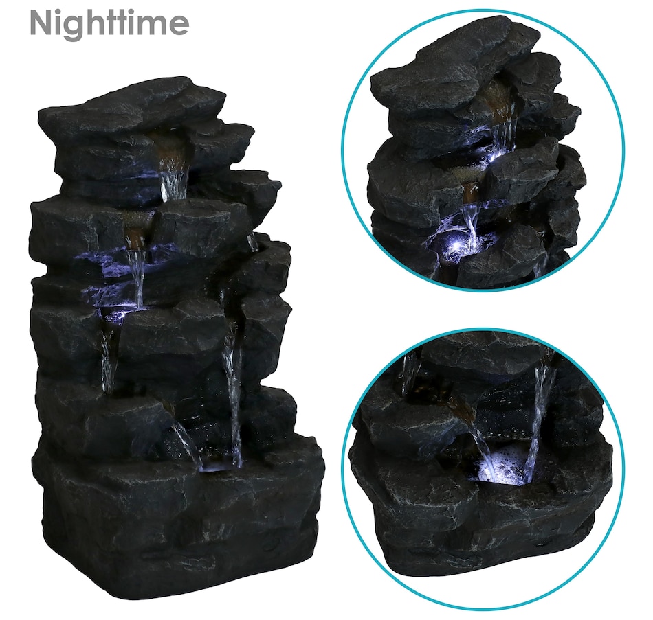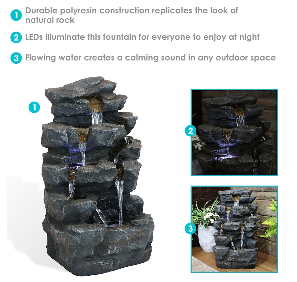 Add a touch of natural beauty and some relaxing, soothing soundscapes to your lawn, garden, or patio with this elegant outdoor fountain inspired by waterfalls found in caves and other rocky environments. Made of durable yet lightweight polyresin, this fountain has the appearance of natural stone without the added maintenance and heaviness of real stone. Plus, everyone will love the soothing sound of running water as streams trickle over the rocks. Place it in any kitchen, sunroom, garden, patio, or other living space. Illuminated by 3 LED lights, enjoy the beauty of this fountain at any time, day or night. This fountain features an electrical submersible pump. Simply fill the fountain up with water, place the pump in the fountain, plug the pump into a standard electrical outlet, and the fountain is ready to go! Transform a space with natural elegance and soothing sounds effortlessly.