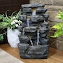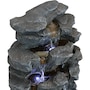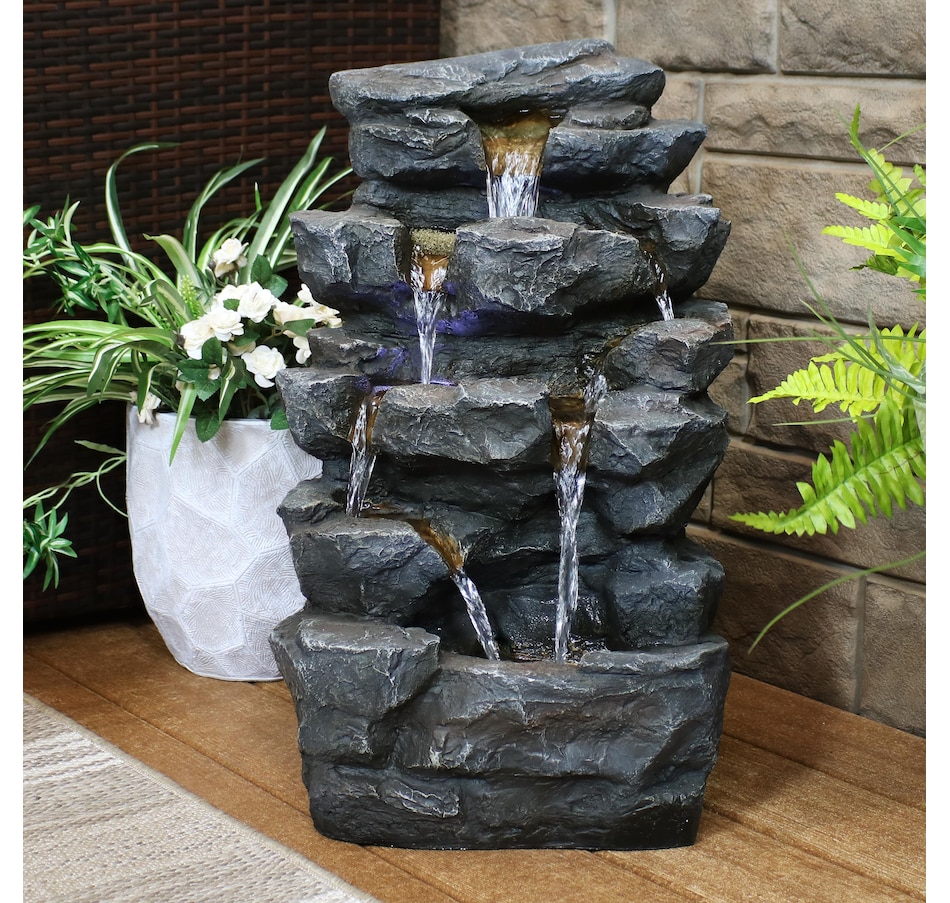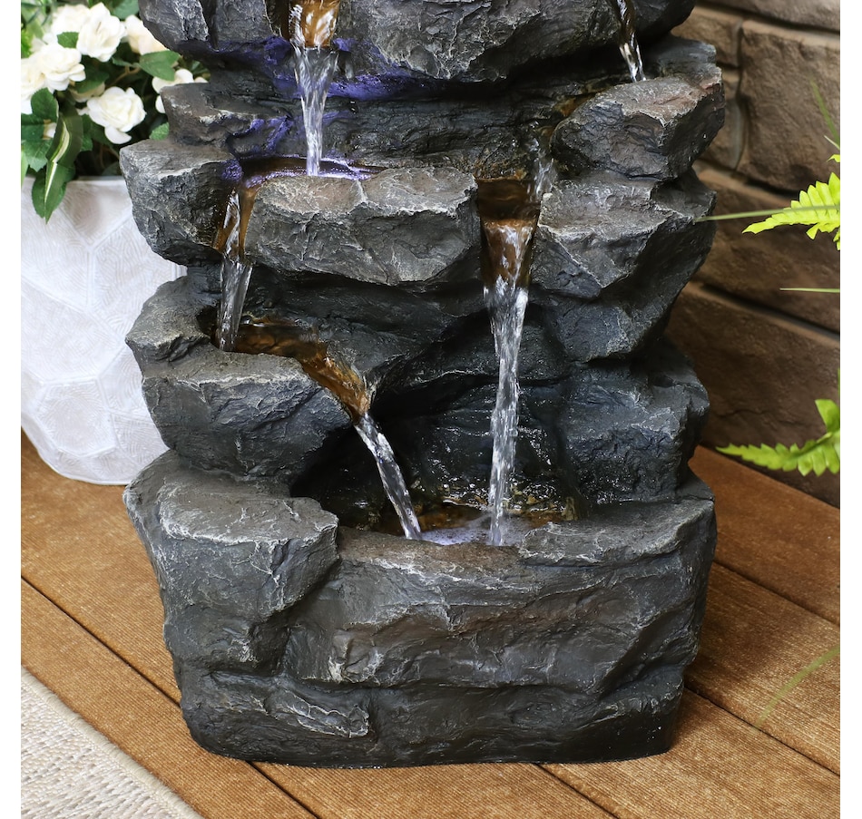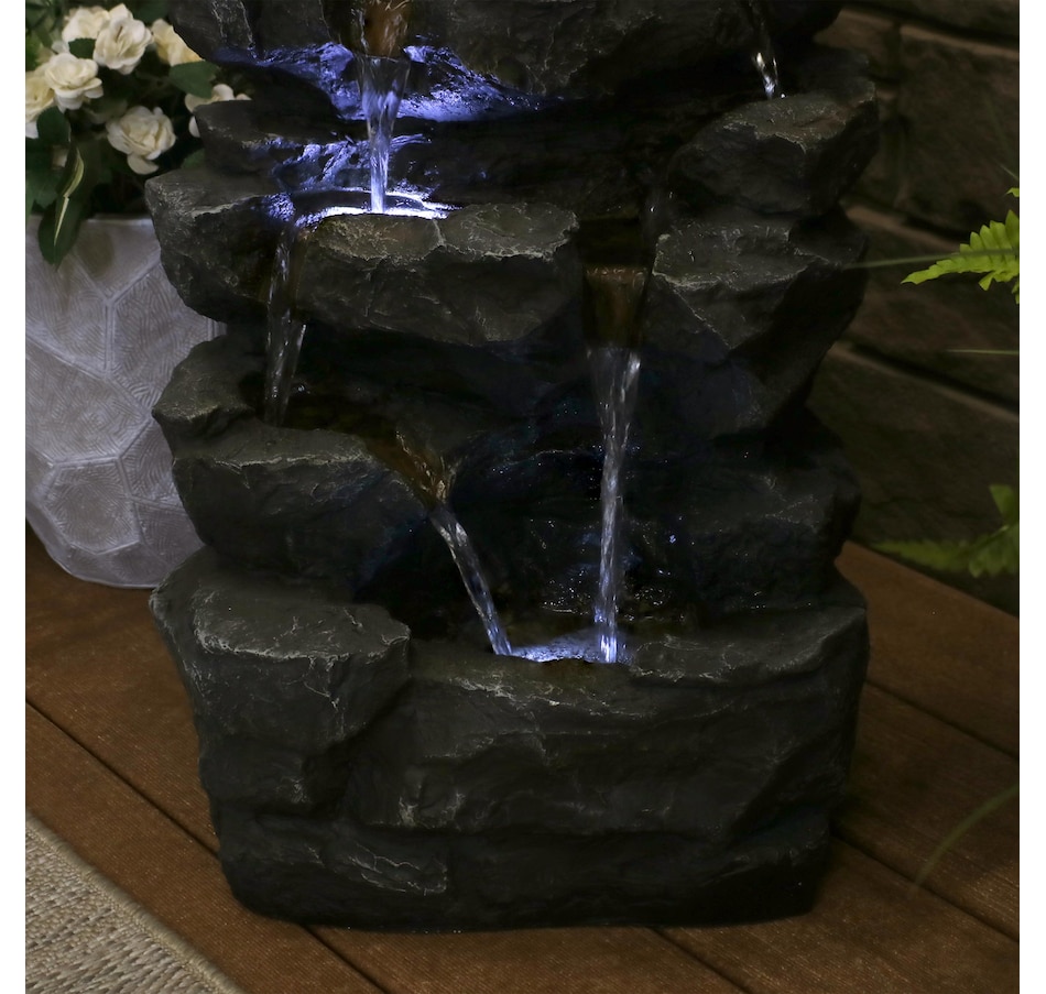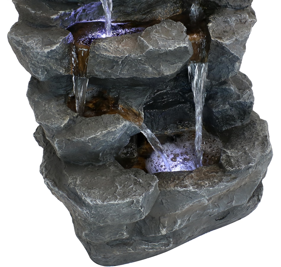 Add a touch of natural beauty and some relaxing, soothing soundscapes to your lawn, garden, or patio with this elegant outdoor fountain inspired by waterfalls found in caves and other rocky environments. Made of durable yet lightweight polyresin, this fountain has the appearance of natural stone without the added maintenance and heaviness of real stone. Plus, everyone will love the soothing sound of running water as streams trickle over the rocks. Place it in any kitchen, sunroom, garden, patio, or other living space. Illuminated by 3 LED lights, enjoy the beauty of this fountain at any time, day or night. This fountain features an electrical submersible pump. Simply fill the fountain up with water, place the pump in the fountain, plug the pump into a standard electrical outlet, and the fountain is ready to go! Transform a space with natural elegance and soothing sounds effortlessly.