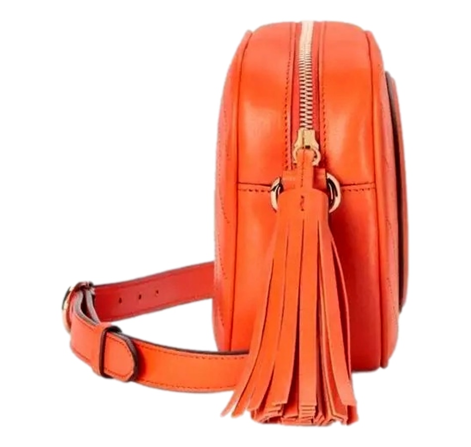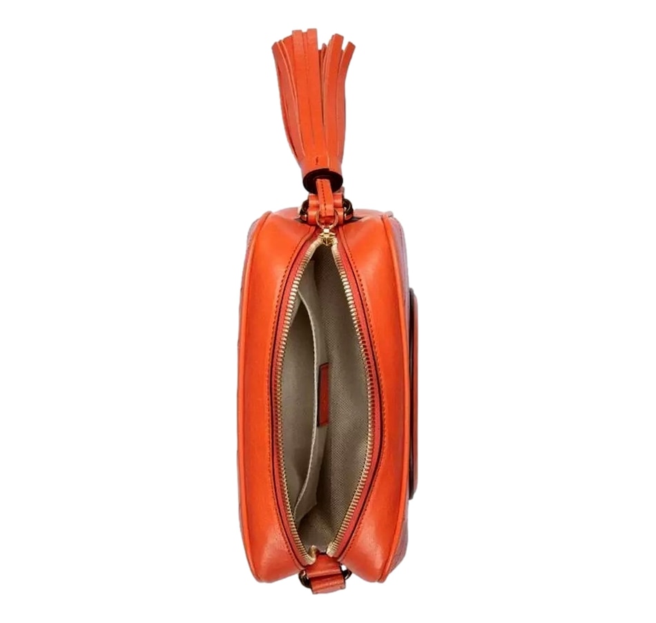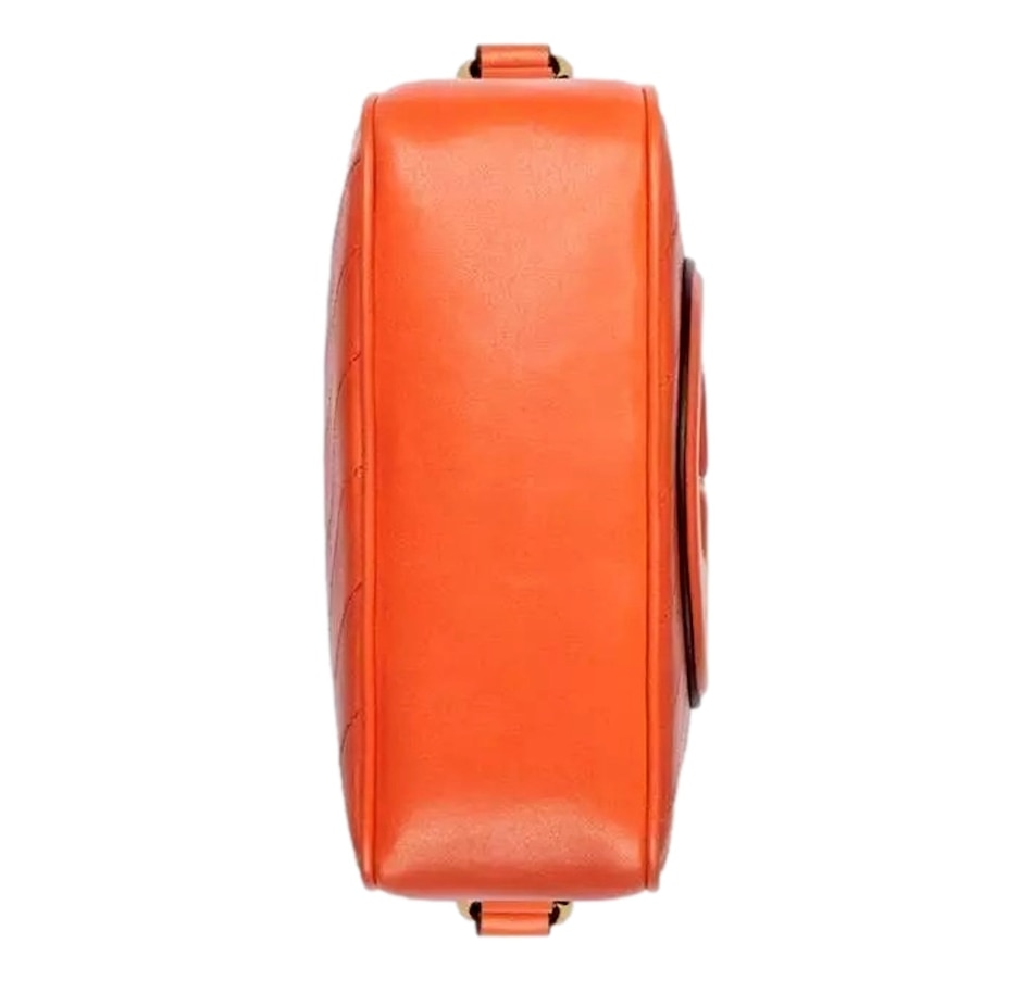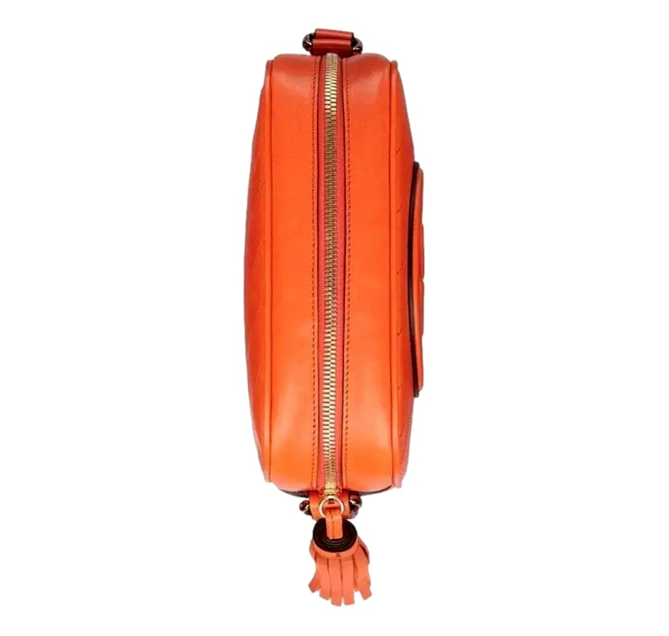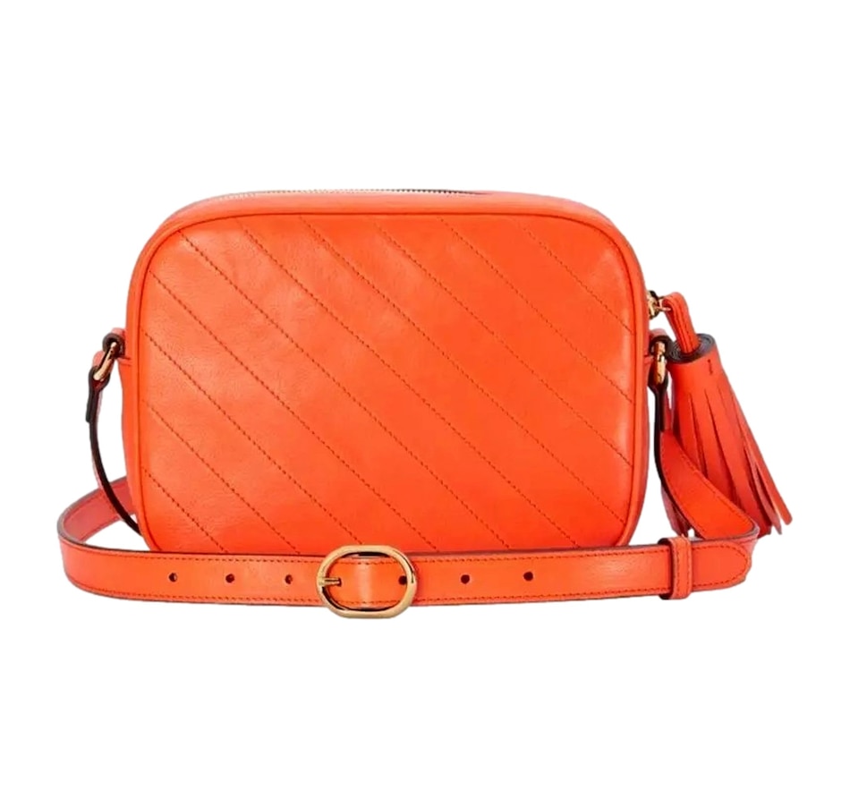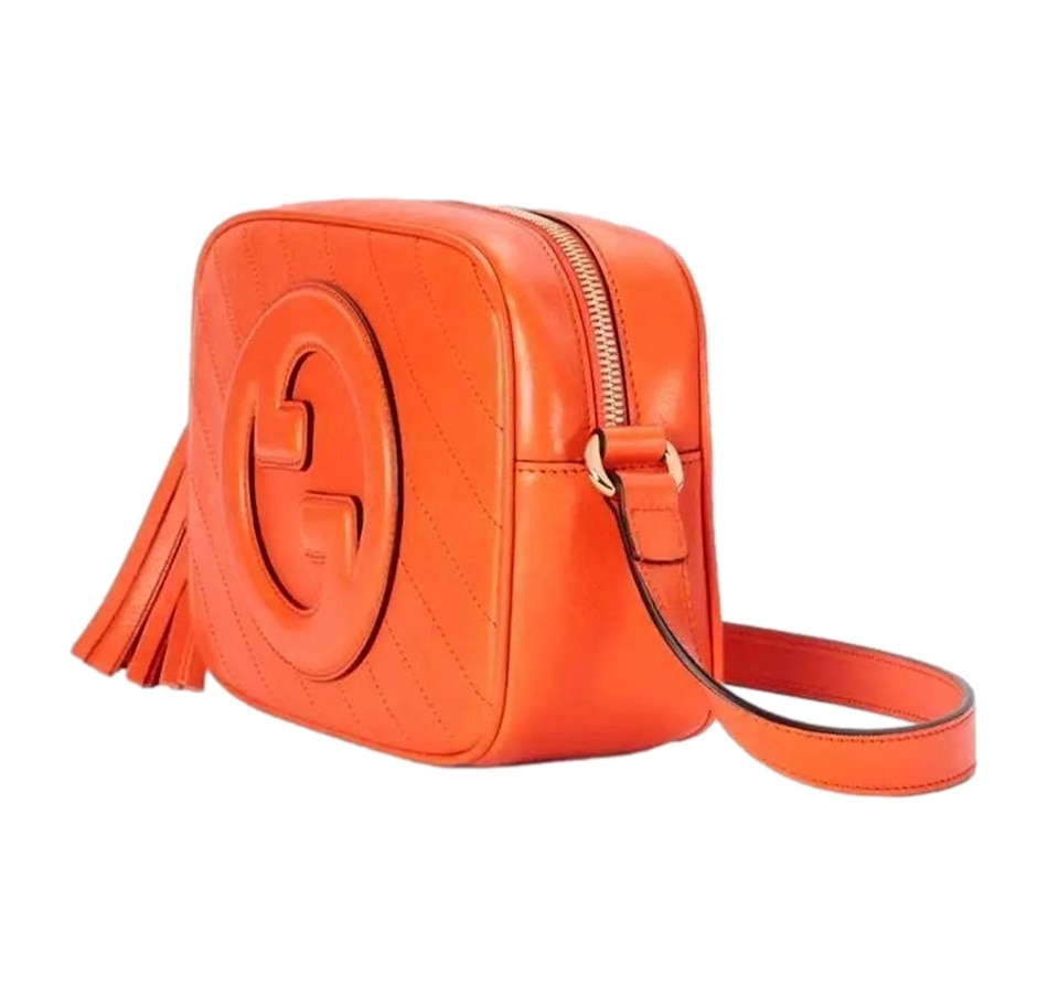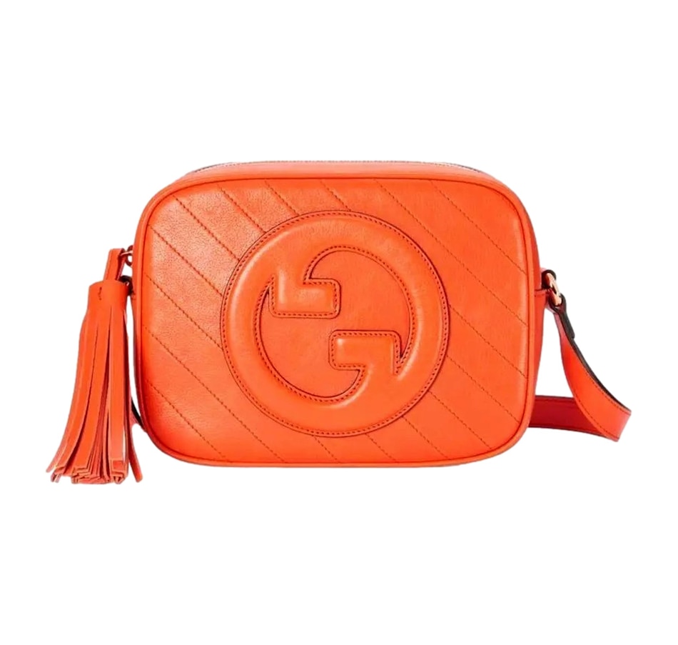 The Gucci Blondie Orange Leather Crossbody Handbag is a striking and vibrant addition to Gucci's iconic collection, combining bold design elements with sophisticated craftsmanship. Crafted from soft, high-quality leather, the bag features a rich orange hue that instantly commands attention, adding a pop of color to any outfit. The standout design feature is the Diagonal Stitching, which creates a unique, textured pattern across the surface of the bag, giving it a contemporary, artisanal flair. Gucci looked to its archives for the Interlocking G patch that centers the Gucci Blondie in a playful yet refined style that adds an extra layer of luxury and recognition to the piece. With a sleek and structured silhouette, the handbag is both functional and fashionable, featuring a long, adjustable crossbody strap for versatile wear. This allows for effortless styling, whether worn casually across the body for everyday use or as a chic accessory for evening outings. Inside, the handbag is thoughtfully designed with ample space for essentials like cards, cash, and small items, ensuring both style and practicality. The Gucci Orange Leather Crossbody Handbag is the perfect fusion of high fashion, vibrant color, and timeless design, making it a statement piece that adds a touch of Gucci's signature style to any look. Model: 742360 Orange lambskin leather exterior Beige canvas interior with leather Gucci tag Compact camera bag style Zip top closure Internal slot pocket Adjustable shoulder straps Dimensions:  Height 6.5" Width 8.5" Depth 3" Strap drop: 21" (adjustable) Made in Italy Includes Gucci dustbag and authenticity cards