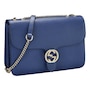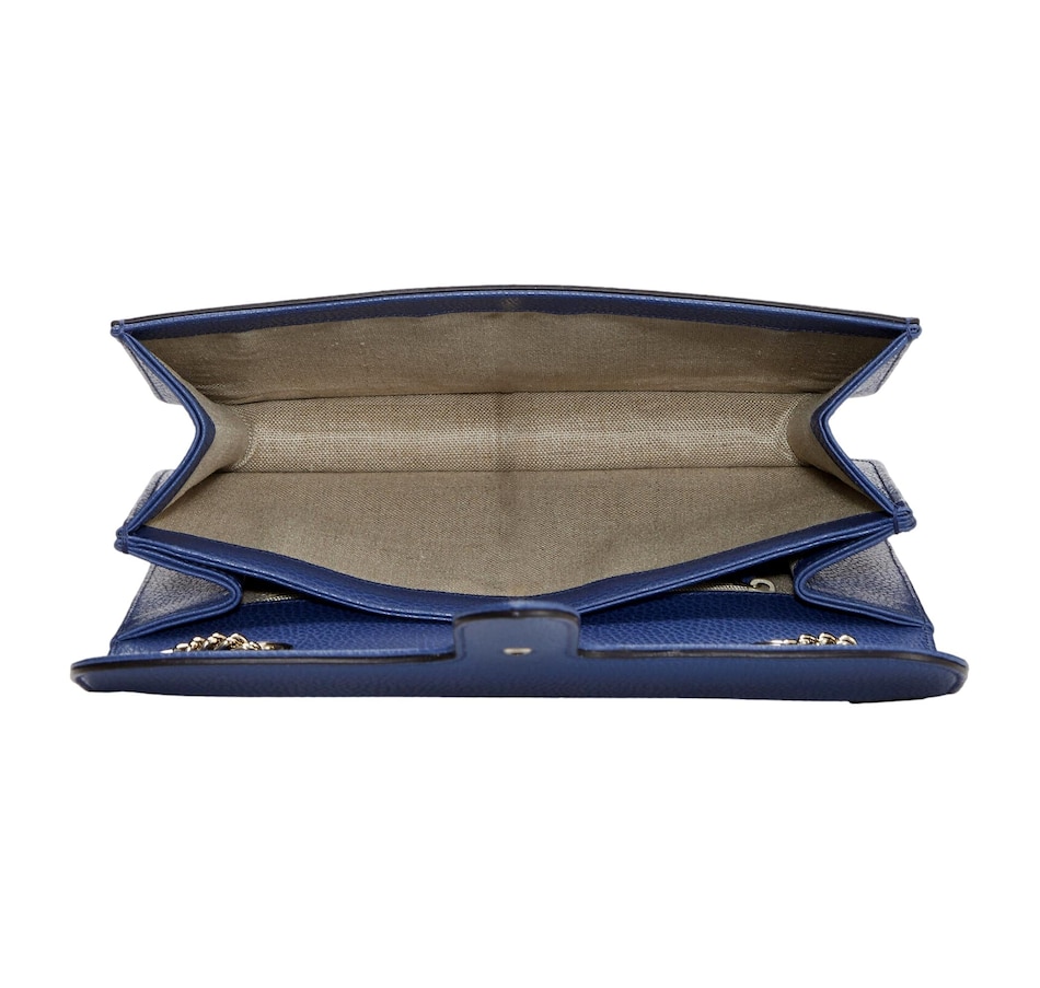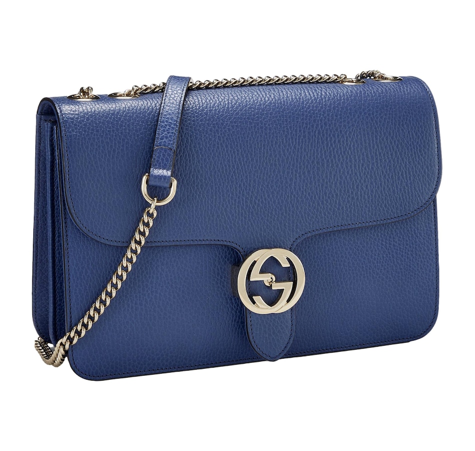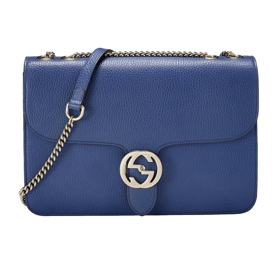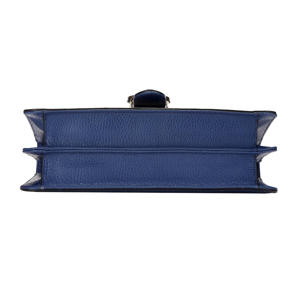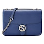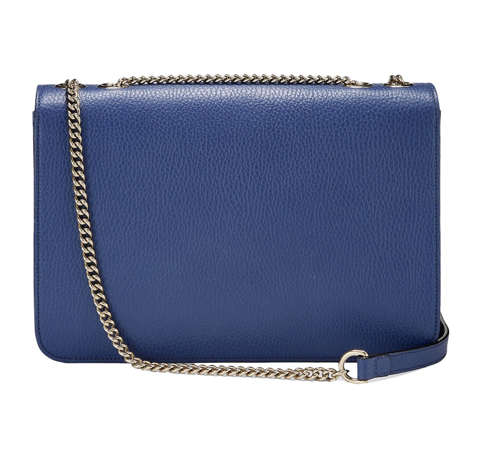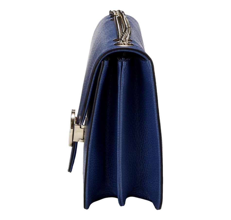 Elevate your look with the Gucci Dollar Interlocking GG Blue Leather Medium Chain Shoulder Bag. Crafted with precision and style, it features a striking blue pebbled leather and the iconic GG flip-lock clasp. Practical yet glamorous, its spacious interior keeps your essentials organized while the sliding chain strap allows versatile styling options. Perfect for any occasion, this bag effortlessly enhances any outfit, making a lasting impression wherever you go. Treat yourself to timeless luxury with this statement shoulder bag, only from Gucci. Model: 510303 Blue pebbled leather Gucci Interlocking GG clasp Light gold-tone hardware Flip-lock closure Beige canvas interior Two interior compartments One interior pocket Chain and leather sliding strap, Drop: 11" or 22" Measurements: 11" x 3" x 7" (LWH) Includes authenticity cards and Gucci Dust bag Made in Italy