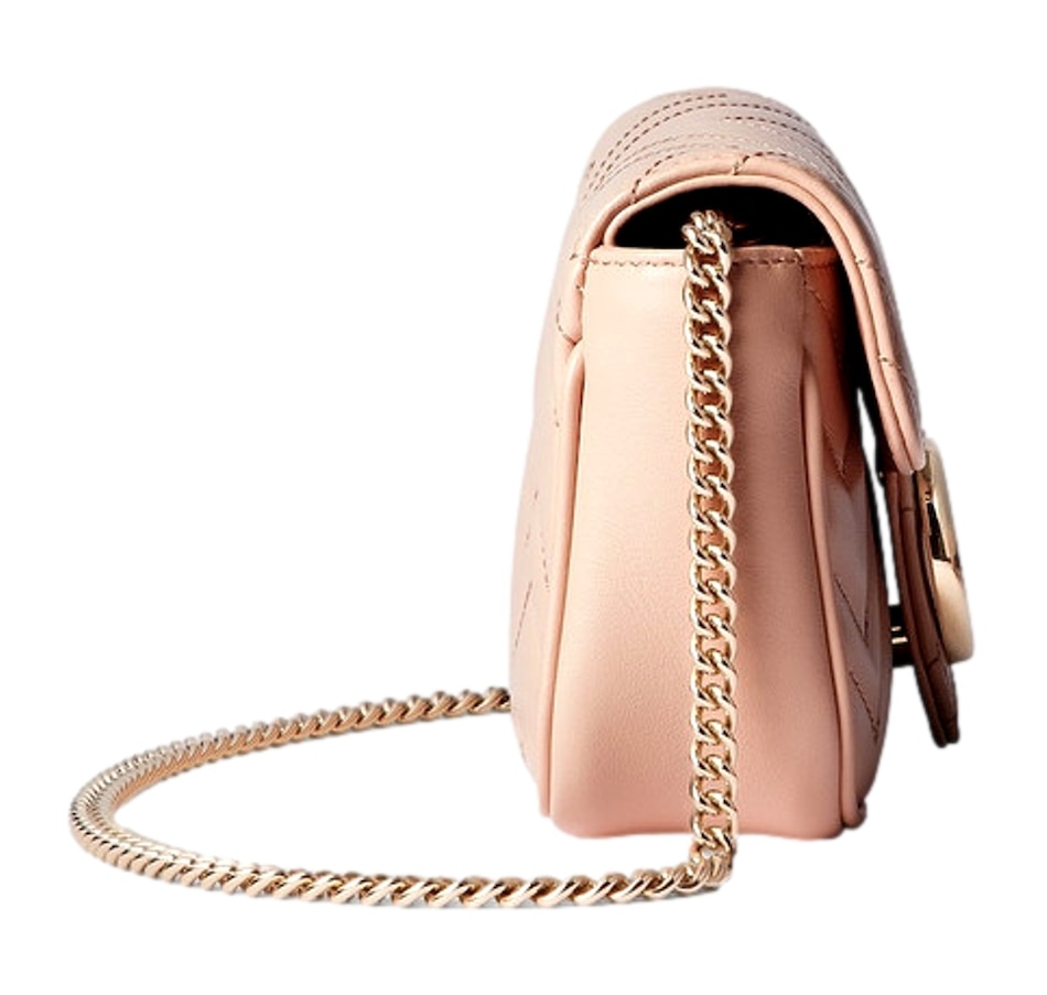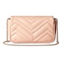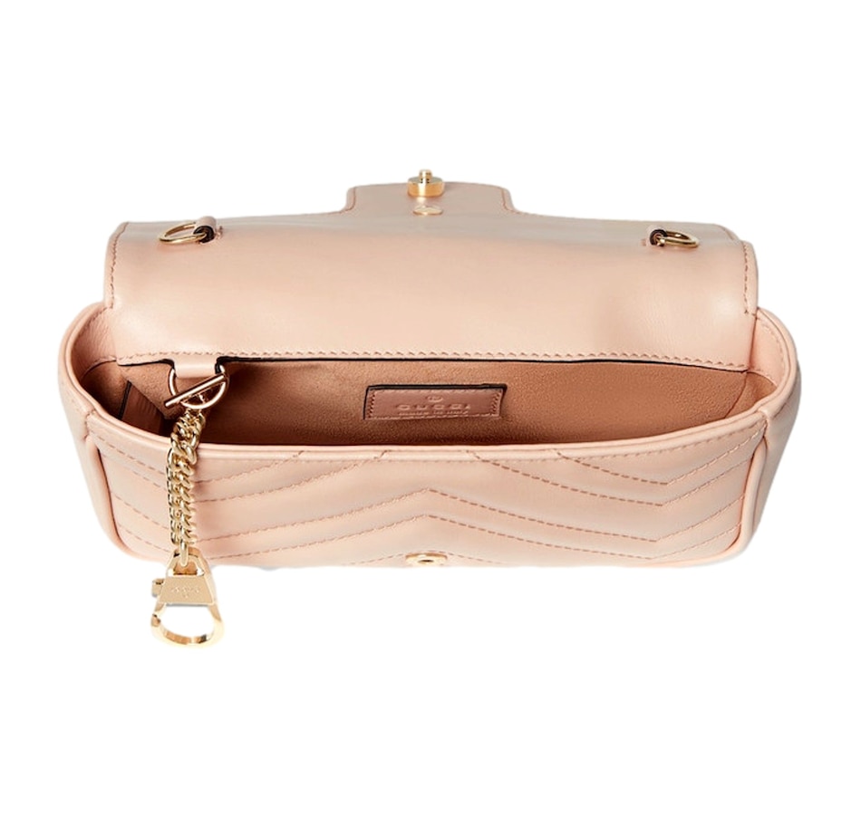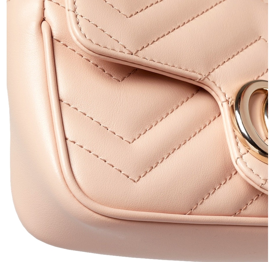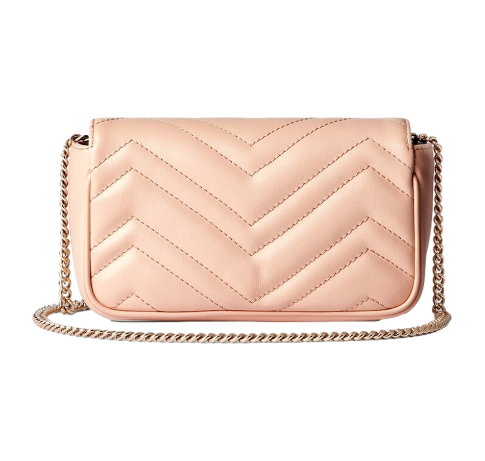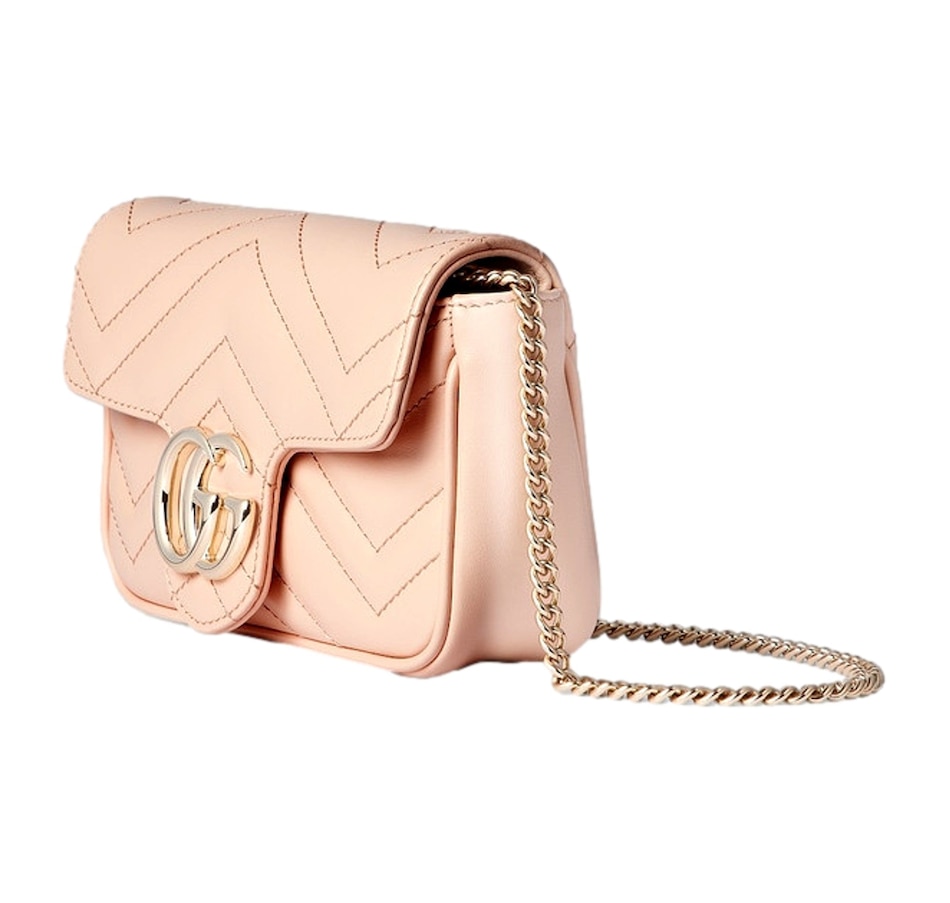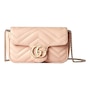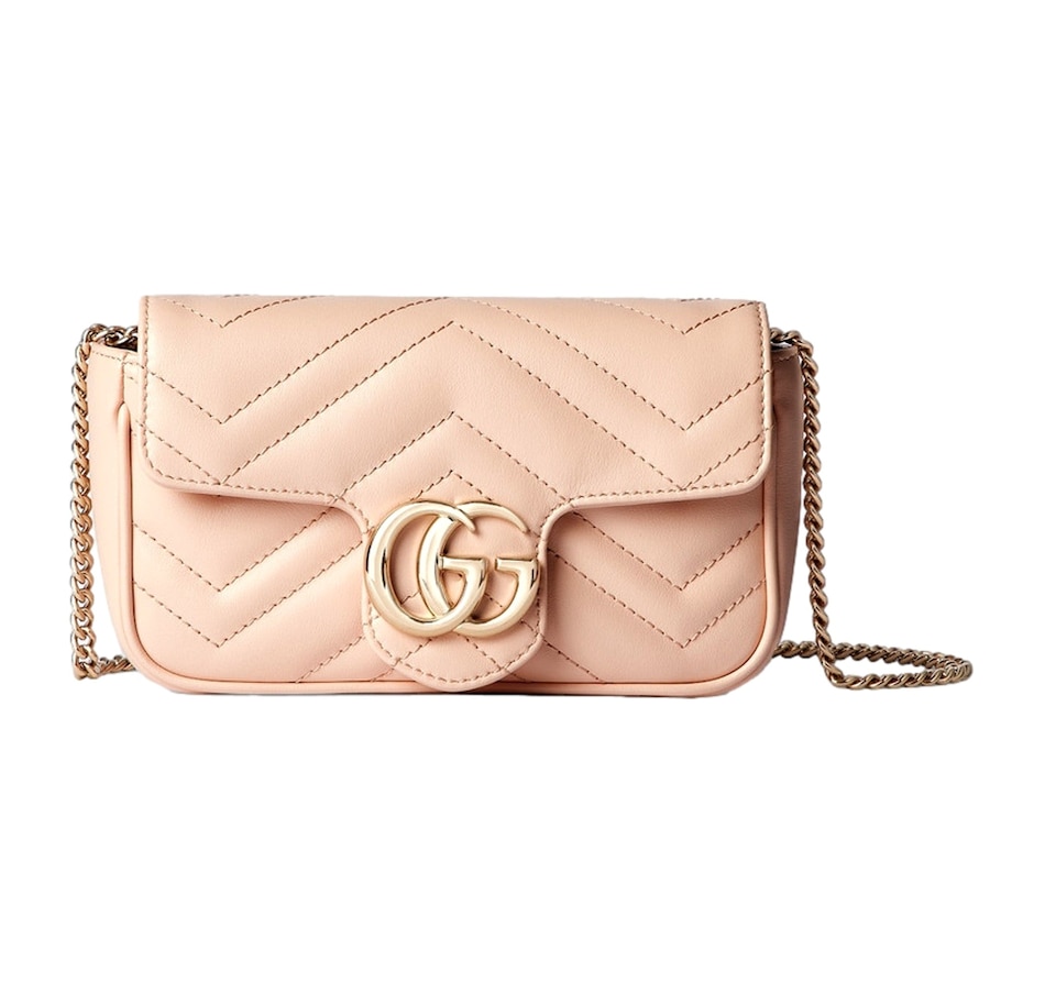 A timeless icon of modern elegance, the Gucci GG Marmont Super Mini in Light Beige Pink exudes effortless sophistication. Crafted from soft matelassé chevron leather and adorned with the signature gold Double G emblem, this compact masterpiece combines versatility and charm. Its delicate chain strap allows for seamless wear from day to night — as a crossbody, shoulder bag, or chic clutch. Refined yet playful, it’s the perfect statement piece for those who appreciate understated luxury. Model: 476433 Light Pink Matelasse Leather GG Emblem in Gold-tone Metal Gold Adjustable Chain Strap Beige Microfiber Interior Interior Lobster Clasp for Wallet Strap Drop: 23" Dimensions: 6.5' x 2" 3.5" (LWH) Made in Italy Includes Gucci Dust bag and Authenticity Cards