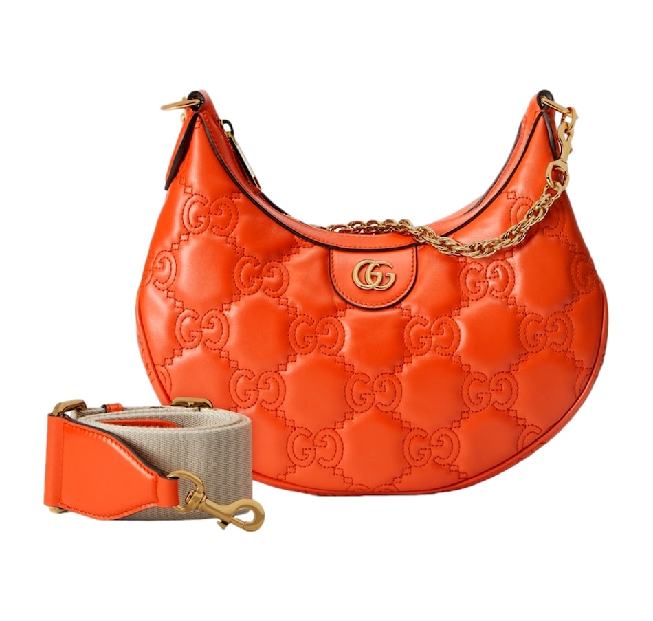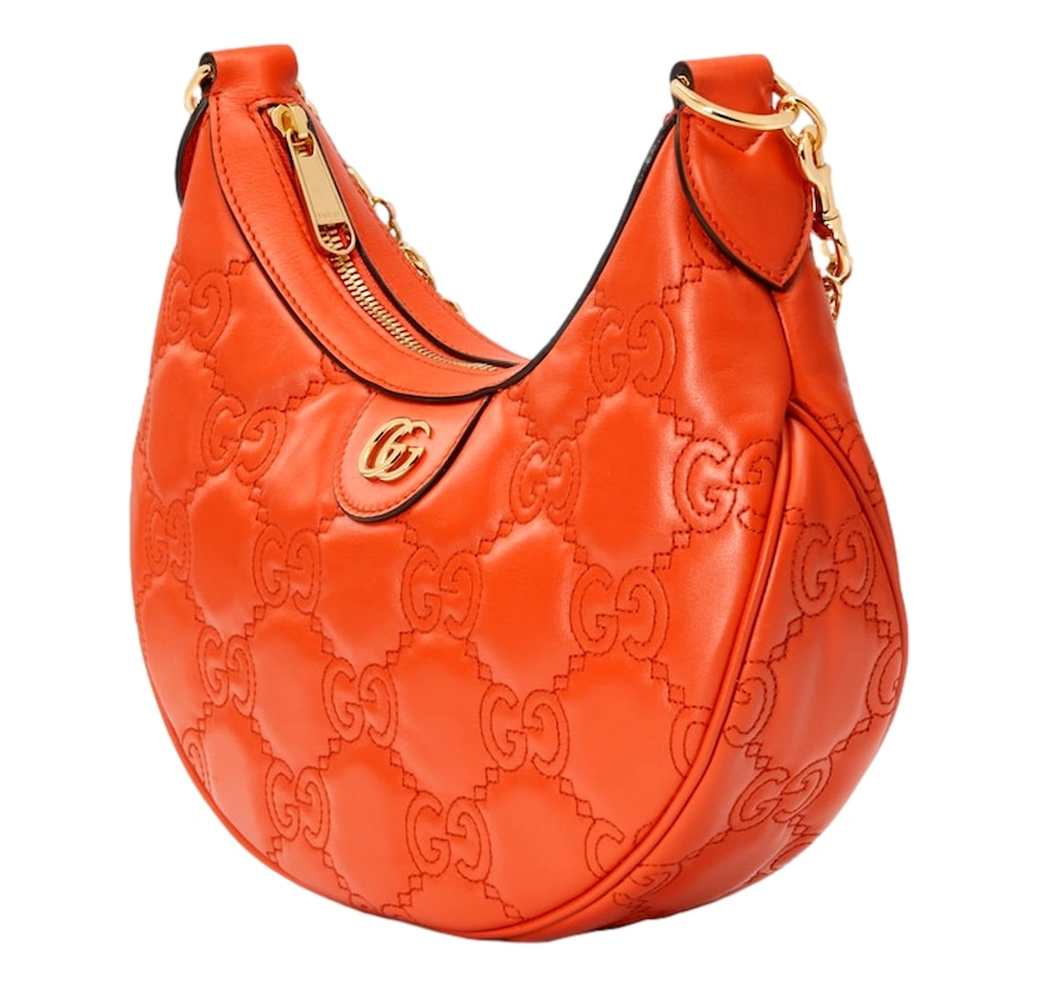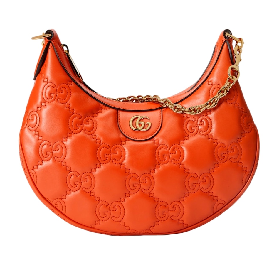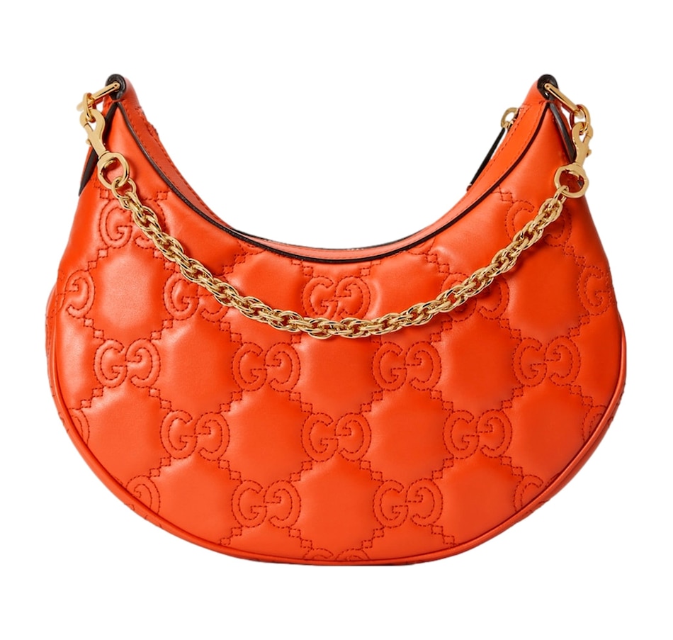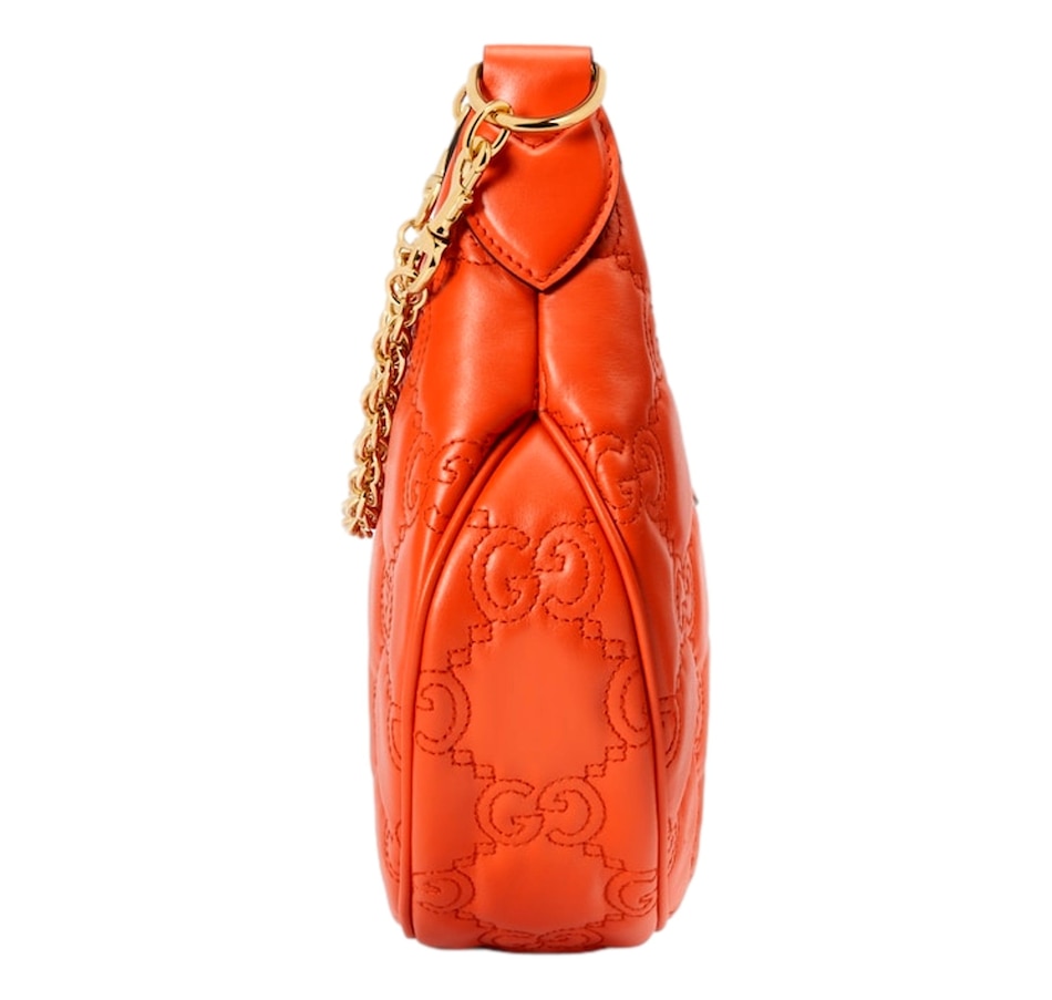 The Gucci GG Quilted Matelassé Leather Small Shoulder Handbag in Orange is a striking, contemporary piece that blends bold color with Gucci's iconic craftsmanship. Crafted from rich, quilted matelassé leather, this handbag features a plush texture that exudes luxury, while its vibrant orange hue adds an unexpected pop of color to any outfit.