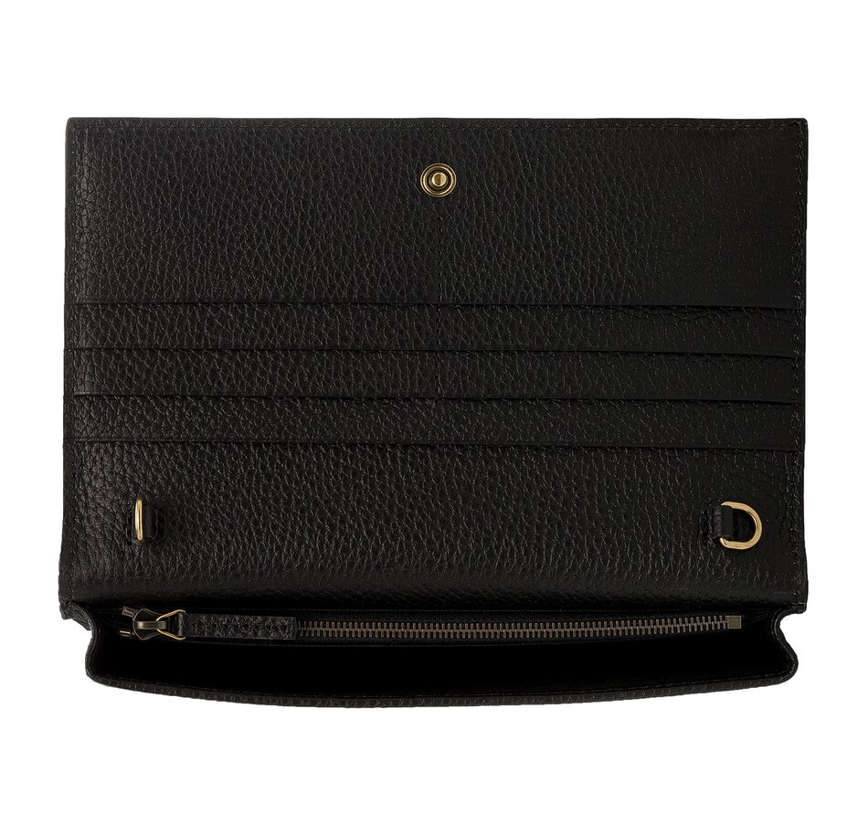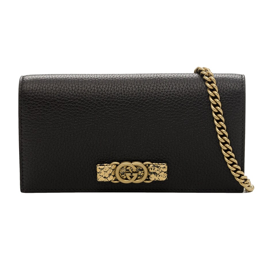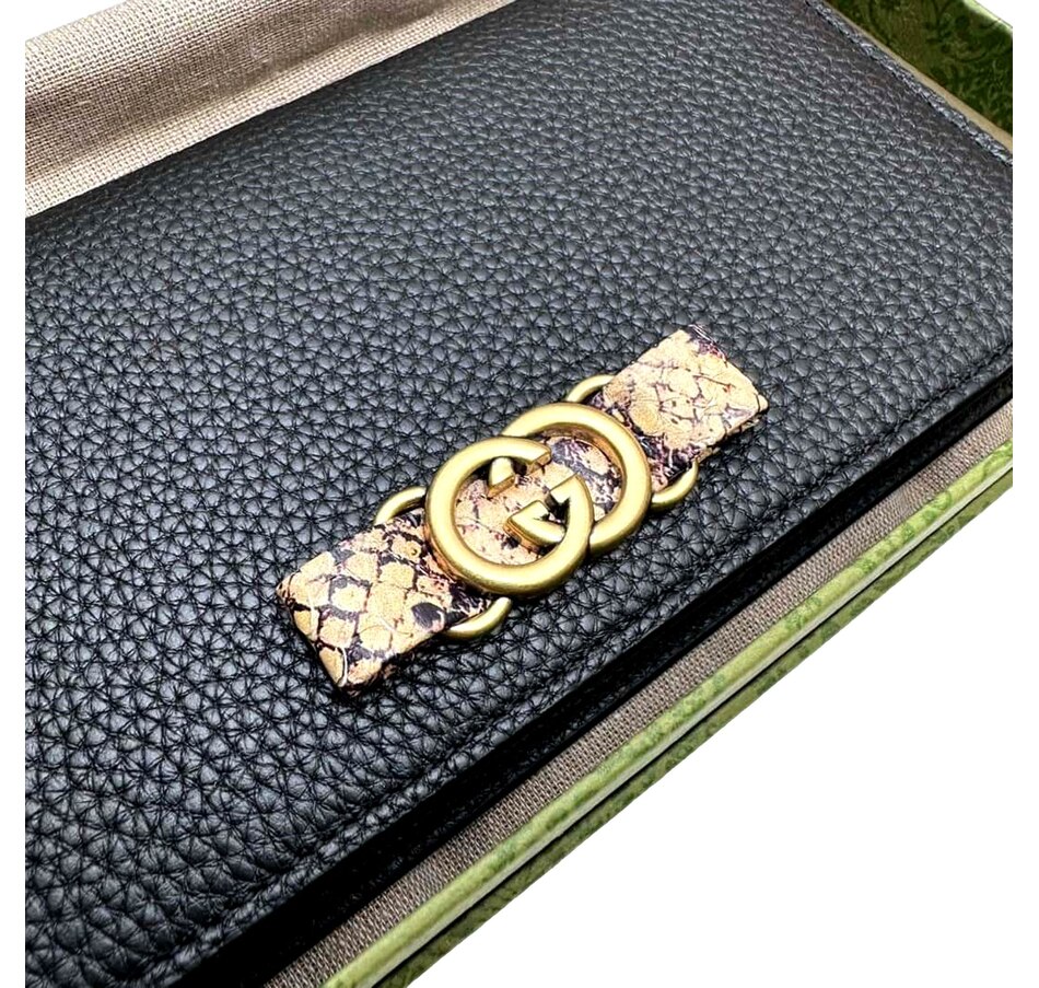 At the center of the wallet, the iconic Interlocking G logo in gold-tone metal adds a signature touch of Gucci's unmistakable style. The combination of the iconic logo, the rich leather, and the python leather bow elevates this wallet to a truly luxurious accessory.