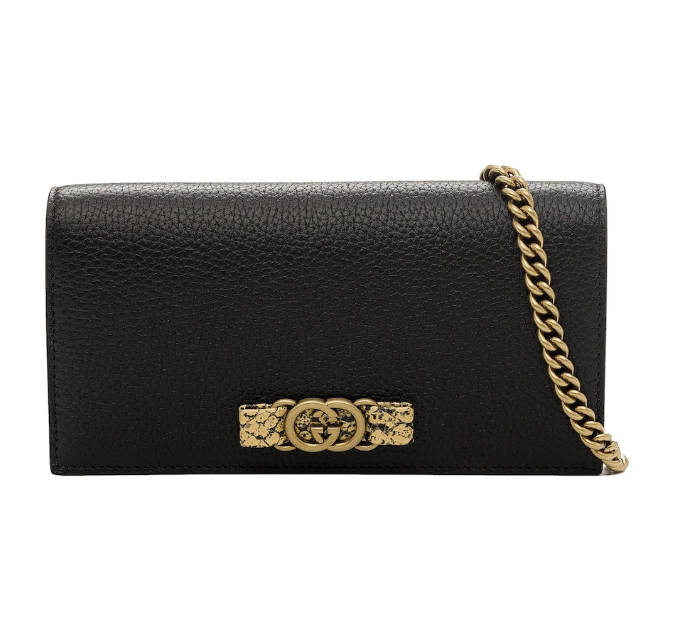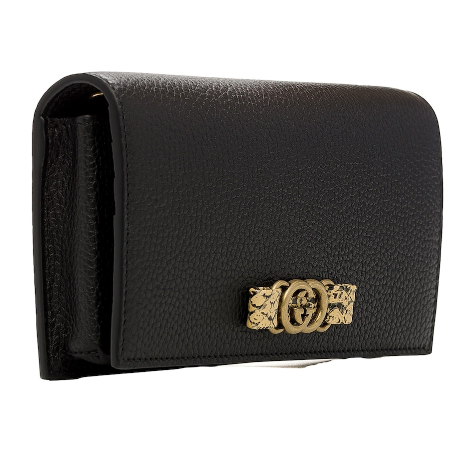 At the center of the wallet, the iconic Interlocking G logo in gold-tone metal adds a signature touch of Gucci's unmistakable style. The combination of the iconic logo, the rich leather, and the python leather bow elevates this wallet to a truly luxurious accessory.